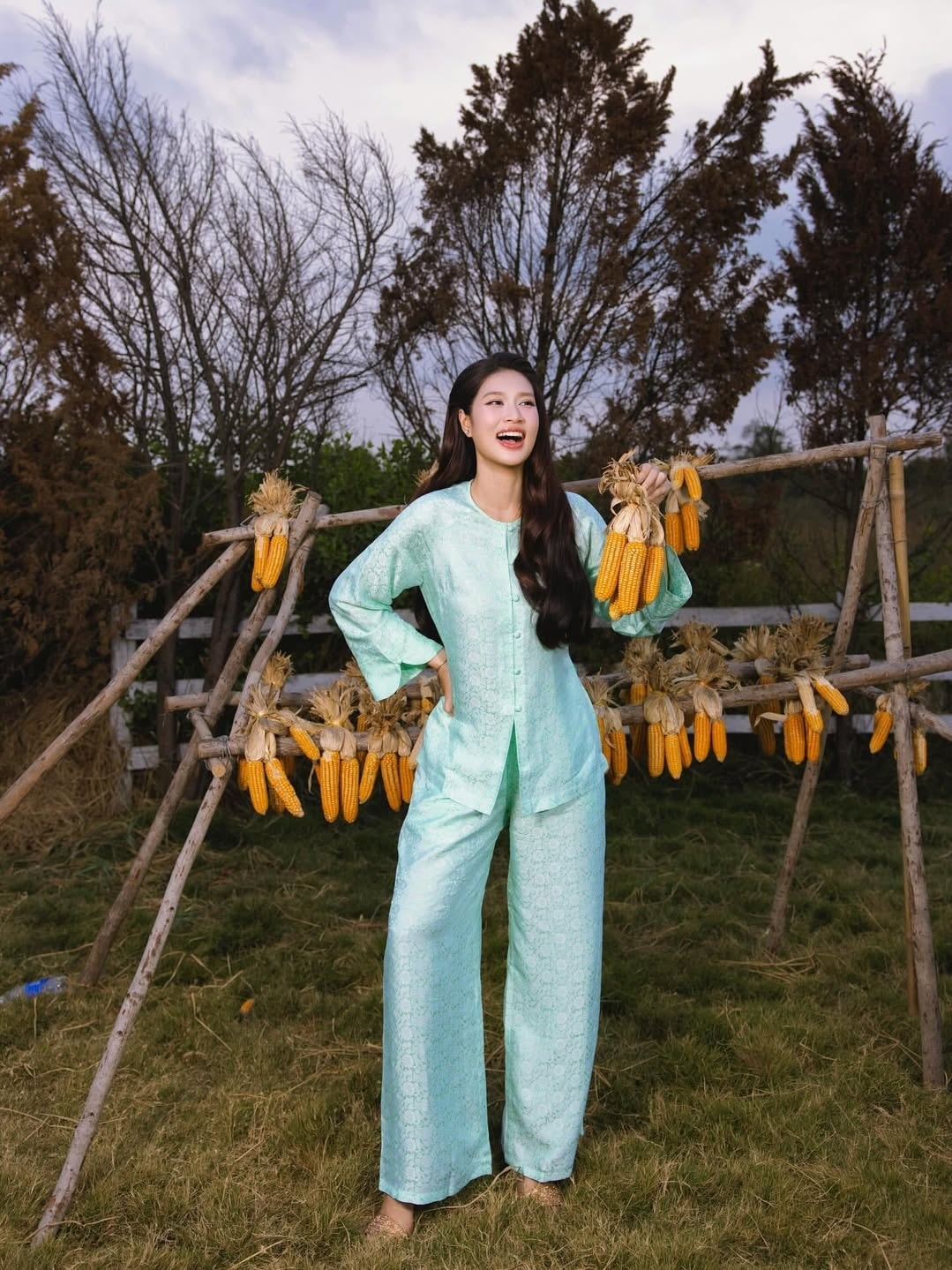 Hòa theo xu hướng còn có Hoa hậu Phương Khánh. Để tạo khác biệt, cô phối áo xanh cùng quần lụa vàng thay vì diện cả bộ đồng màu.