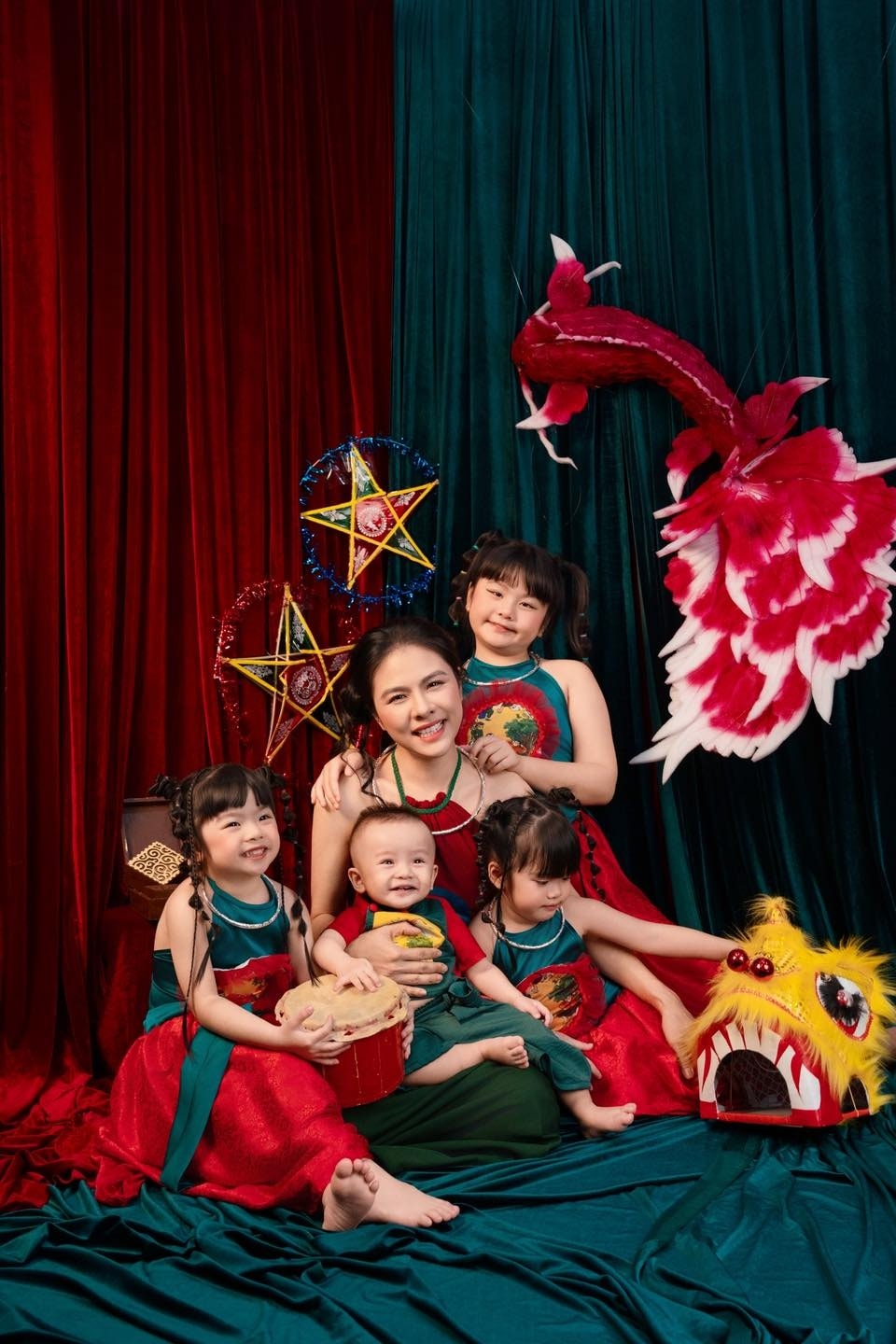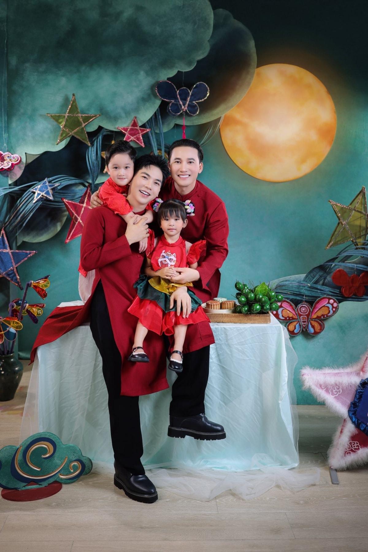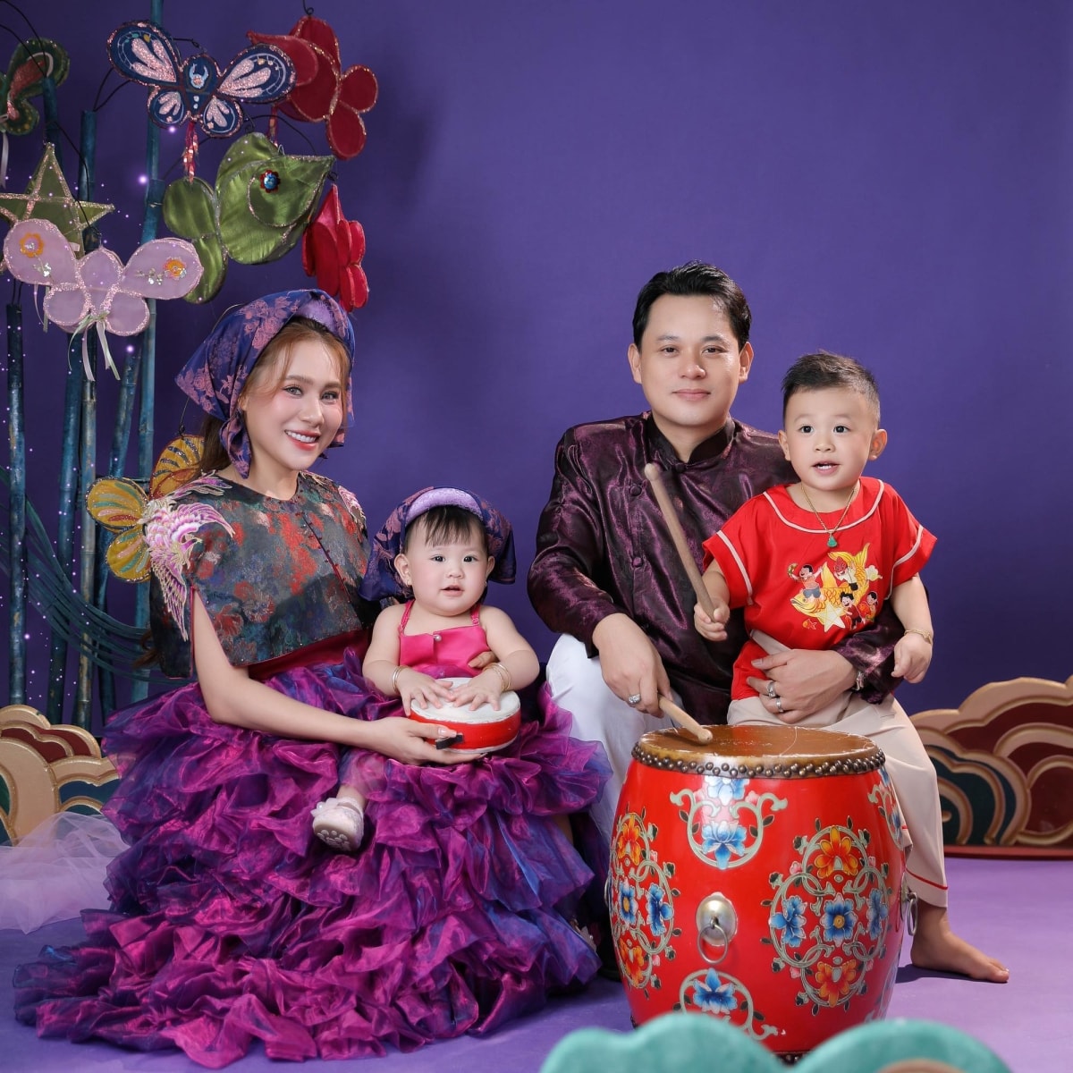 Gia đình Hà Trí Quang chụp ảnh giữa không gian đậm chất truyền thống. Bé Kaka và Muội Muội chào đời bằng phương pháp thụ tinh nhân tạo. Hai con được Hà Trí Quang và bạn đời Thanh Đoàn chăm chút trong cách ăn mặc từ nhỏ.
