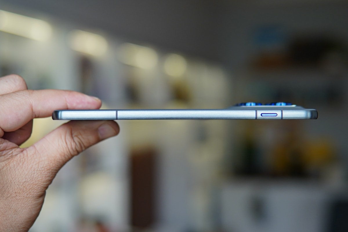 Hệ thống phím vật lý bao gồm nút nguồn và cụm tăng giảm âm lượng được đặt tập trung ở cạnh phải. Các nút bấm này có thiết kế mảnh, hành trình phím ngắn, dù vậy vẫn đảm bảo độ nảy và phản hồi xúc giác rõ ràng, không gây hiện tượng lỏng lẻo dù kích thước khung máy bị giới hạn. Tuy nhiên việc bố trí các dải ăng-ten với màu đậm khiến thân máy có cảm giác bị chia làm nhiều phần, giảm yếu tố thẩm mỹ.