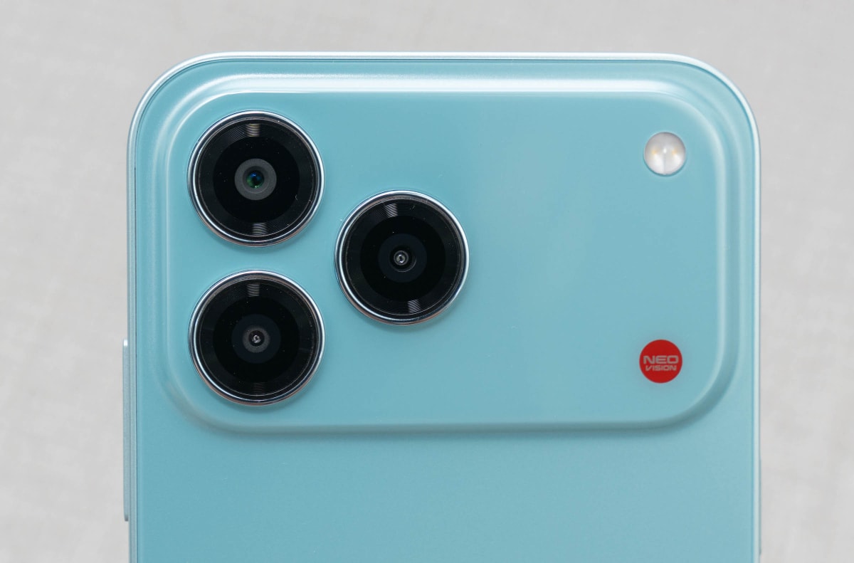 Điểm nhấn của máy là cụm camera kích thước lớn chữ nhật với ba ống kính được bố trí giống iPhone 17 Pro Max. Do ở phân khúc giá rẻ, máy được làm bằng vật liệu nhựa, nhưng mặt lưng áp dụng công nghệ xử lý bề mặt Sky Mirror giả lập kính, tạo hiệu ứng phản chiếu.
