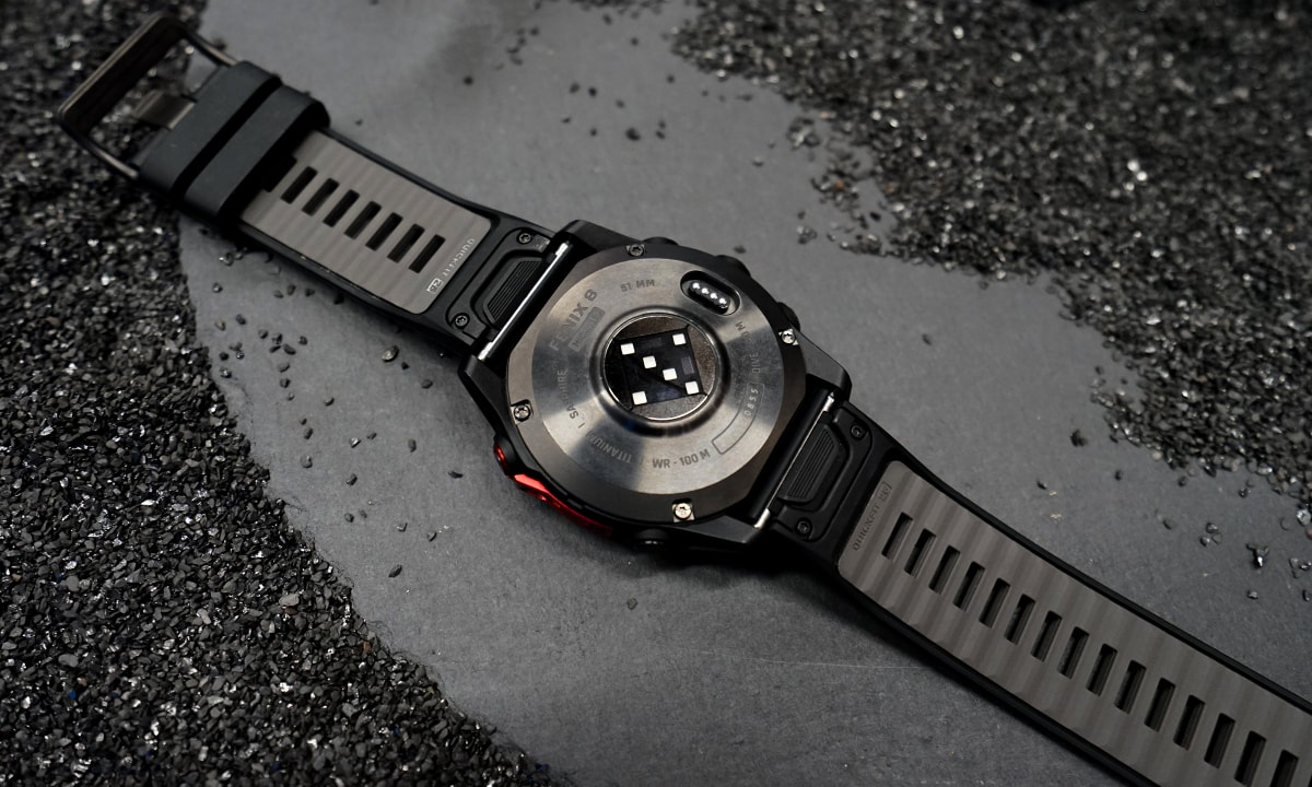 Cạnh trên là nơi đặt đèn pin, sẽ phát ánh sáng đỏ nhấp nháy khi cần phát tín hiệu SOS hoặc phát ánh sáng trắng và đỏ luân phiên theo nhịp vung tay giúp dễ nhận diện trong đêm. Cạnh dưới đặt loa ngoài. Smartwatch dùng dây silicon với kích thước 26 mm, cao hơn so với dây 20 và 22 mm thường thấy. Garmin sử dụng chất liệu titan cho phần viền trên cùng mặt kính sapphire chất lượng cao.