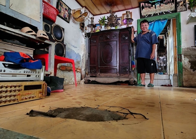 Ông Tài cho biết đã nhiều lần thay nền gạch men nhưng chỉ sau một thời gian lại hư hỏng. Nhà ông nằm gần bờ kênh bị sụt lún từ giữa năm 2023, từng làm hư hại 13 căn hộ, nên cũng chịu ảnh hưởng.