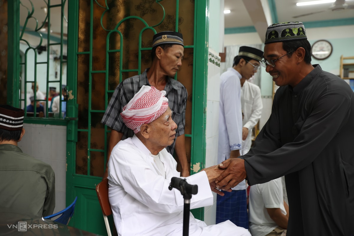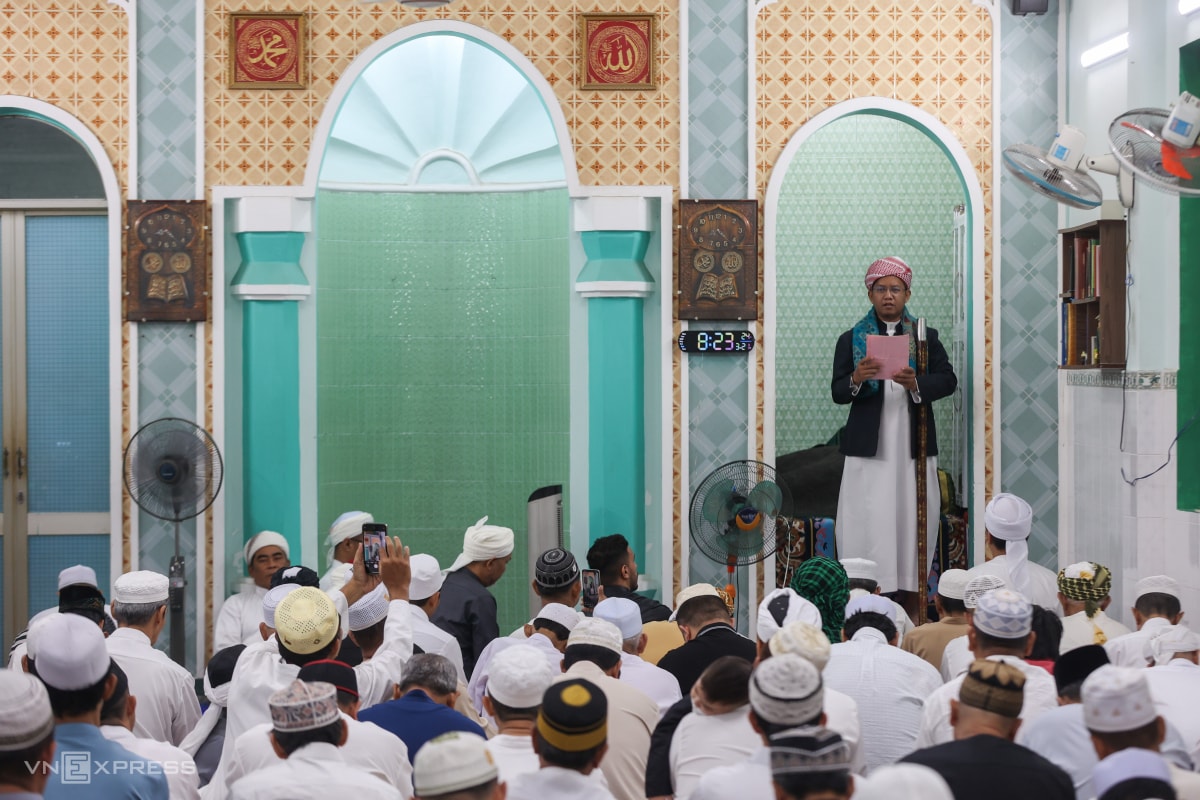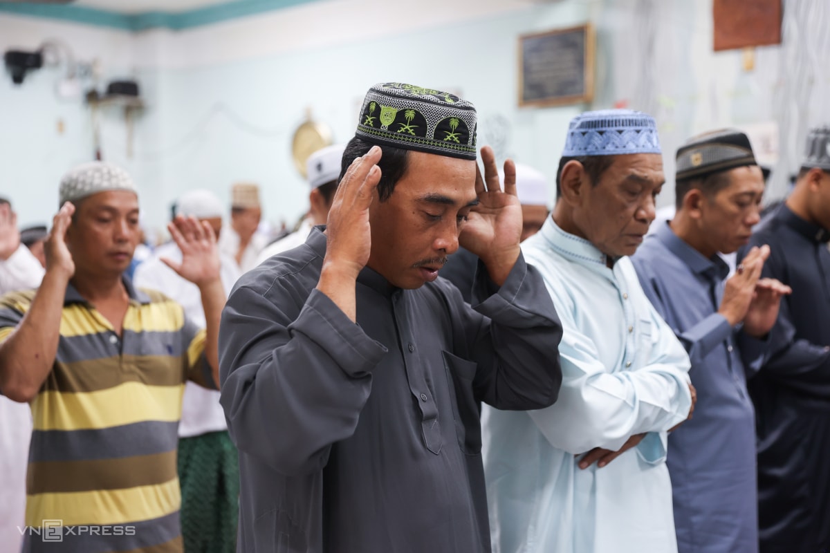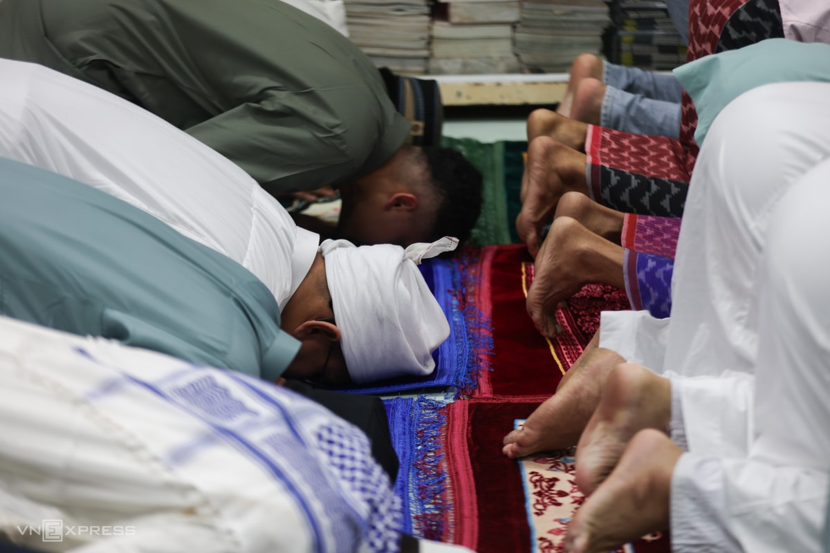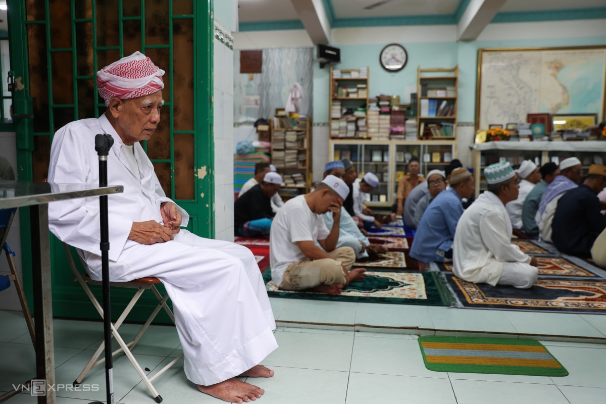 Dười hành lang ở tầng trệt thánh đường, ông Haji Kim Sô, 75 tuổi, giáo cả, Trưởng ban quản trị cộng đồng người Chăm giáo khu Anwar thành kính hành lễ. Tuổi cao nên vị giáo cả không thể đứng hoặc ngồi lâu làm lễ như các tín đồ khác.