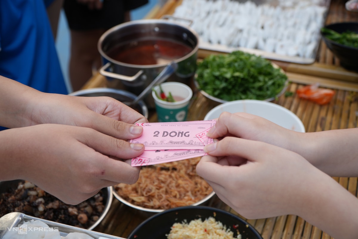 Phiên chợ Tết không dùng tiền mặt. Các em dùng tiền giấy với mệnh giá 2 đồng, 5 đồng. Mỗi học sinh được phát 20 đồng để thưởng thức món ăn, trải nghiệm chụp ảnh. Nếu muốn có nhiều hơn, các em phải vượt qua các thử thách như hát karaoke, vẽ tranh, chơi nhảy bao bố, đua cua.