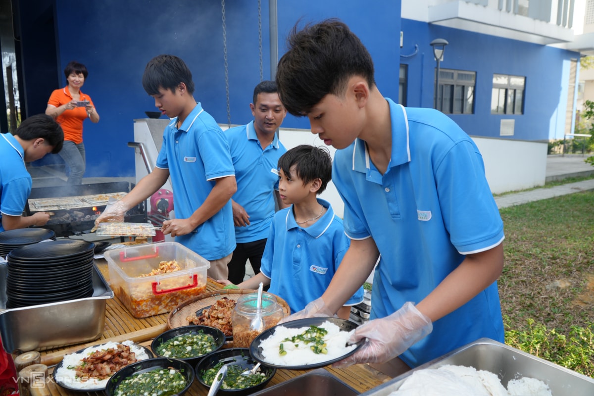 Không chỉ học sinh nữ đứng bếp, nhiều bạn nam cũng trổ tài nấu nướng khi đứng quầy bánh hỏi thịt nướng, chè chuối, bánh flan.