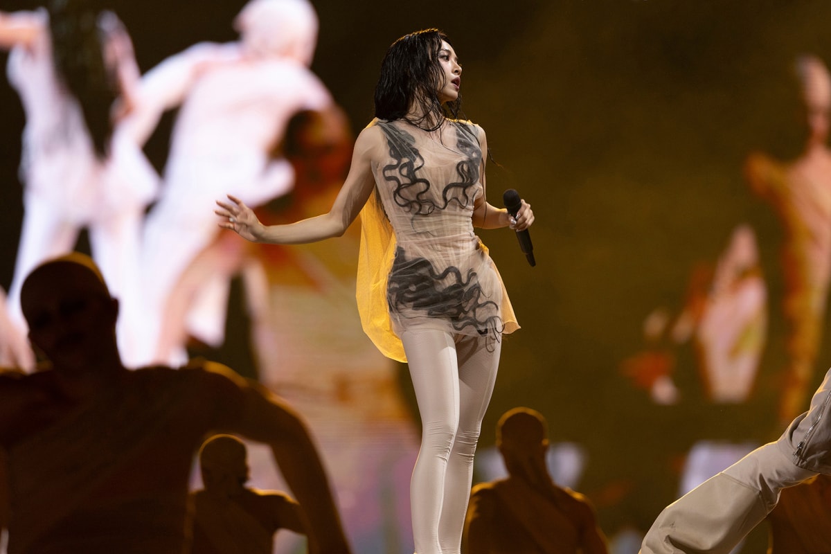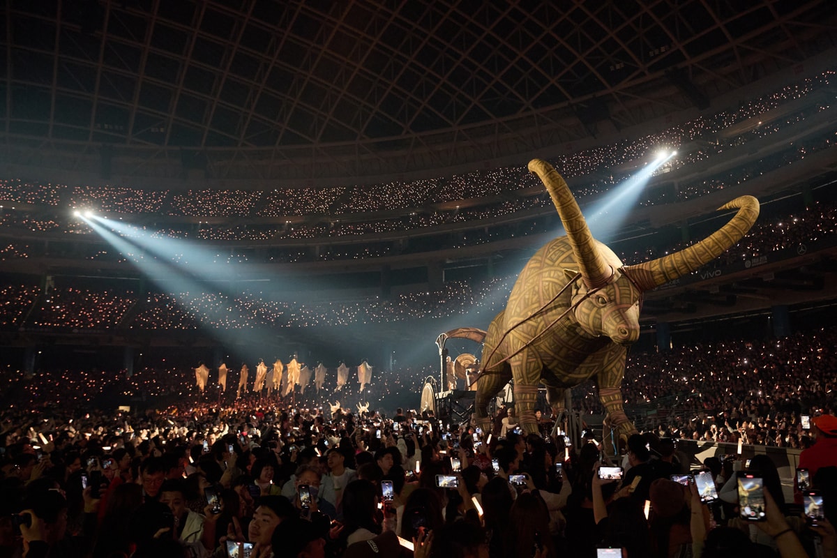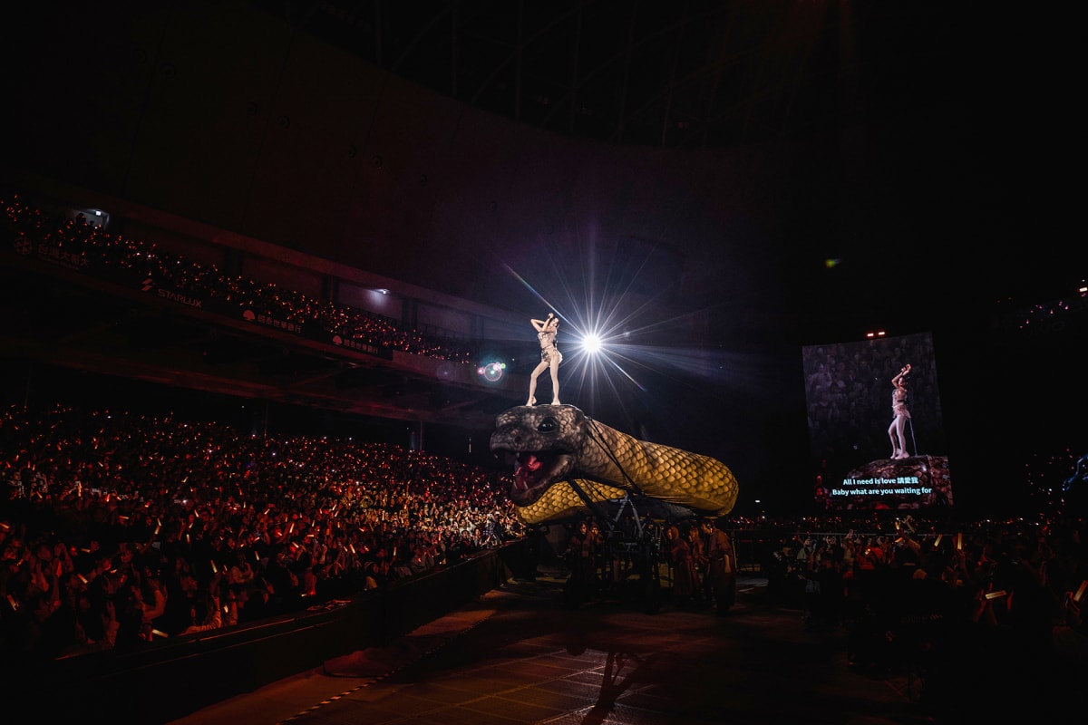 Ca sĩ Thái Y Lâm tạo sự bùng nổ hiệu ứng hình ảnh khi hát trên mô hình rắn khổng lồ, tối 30/12.