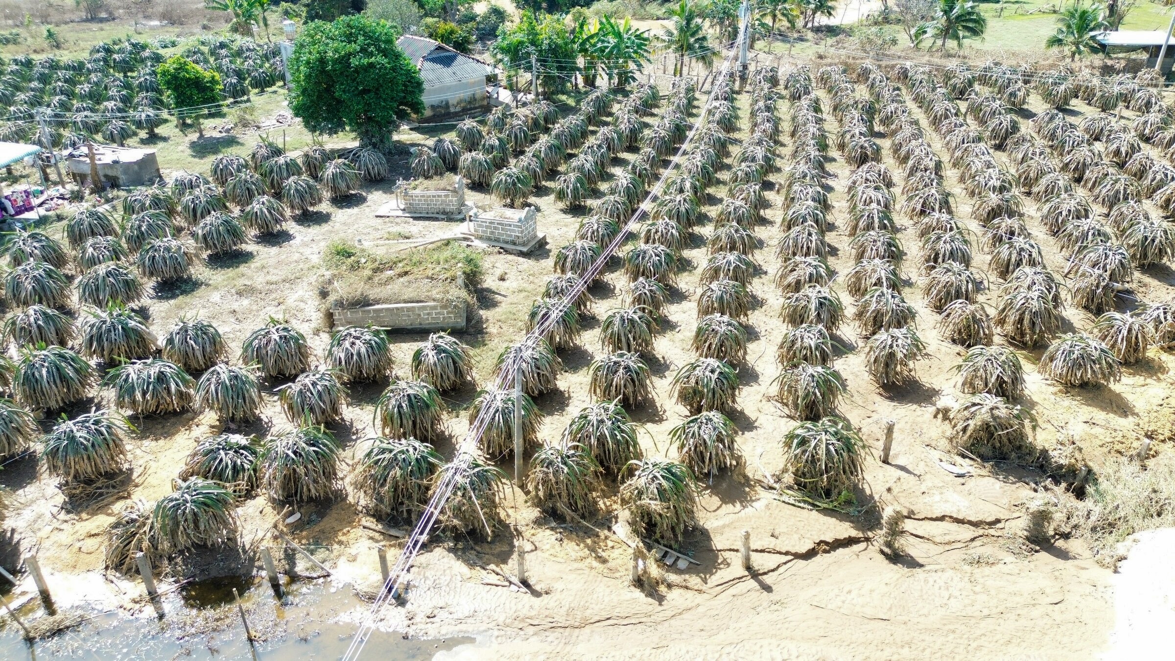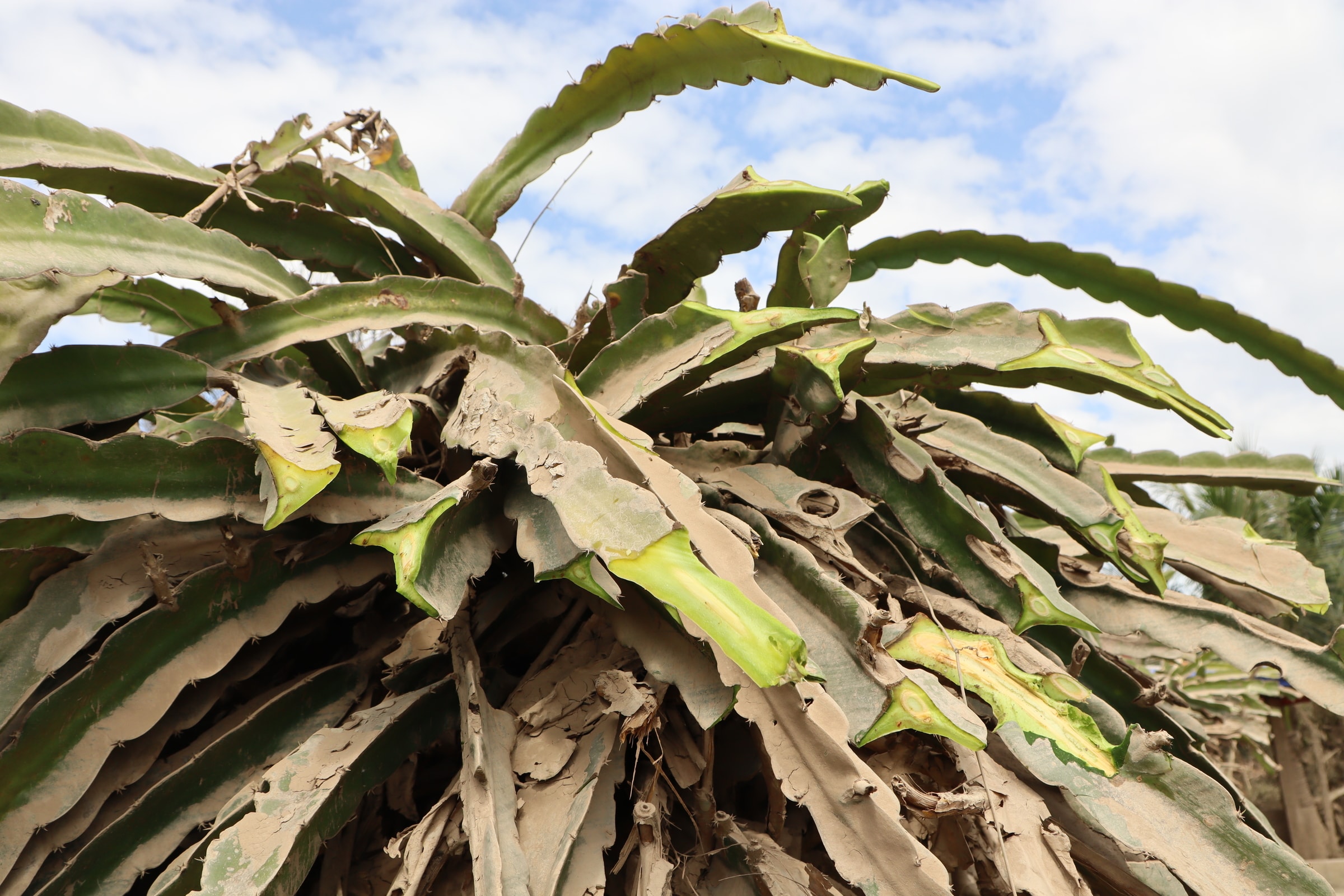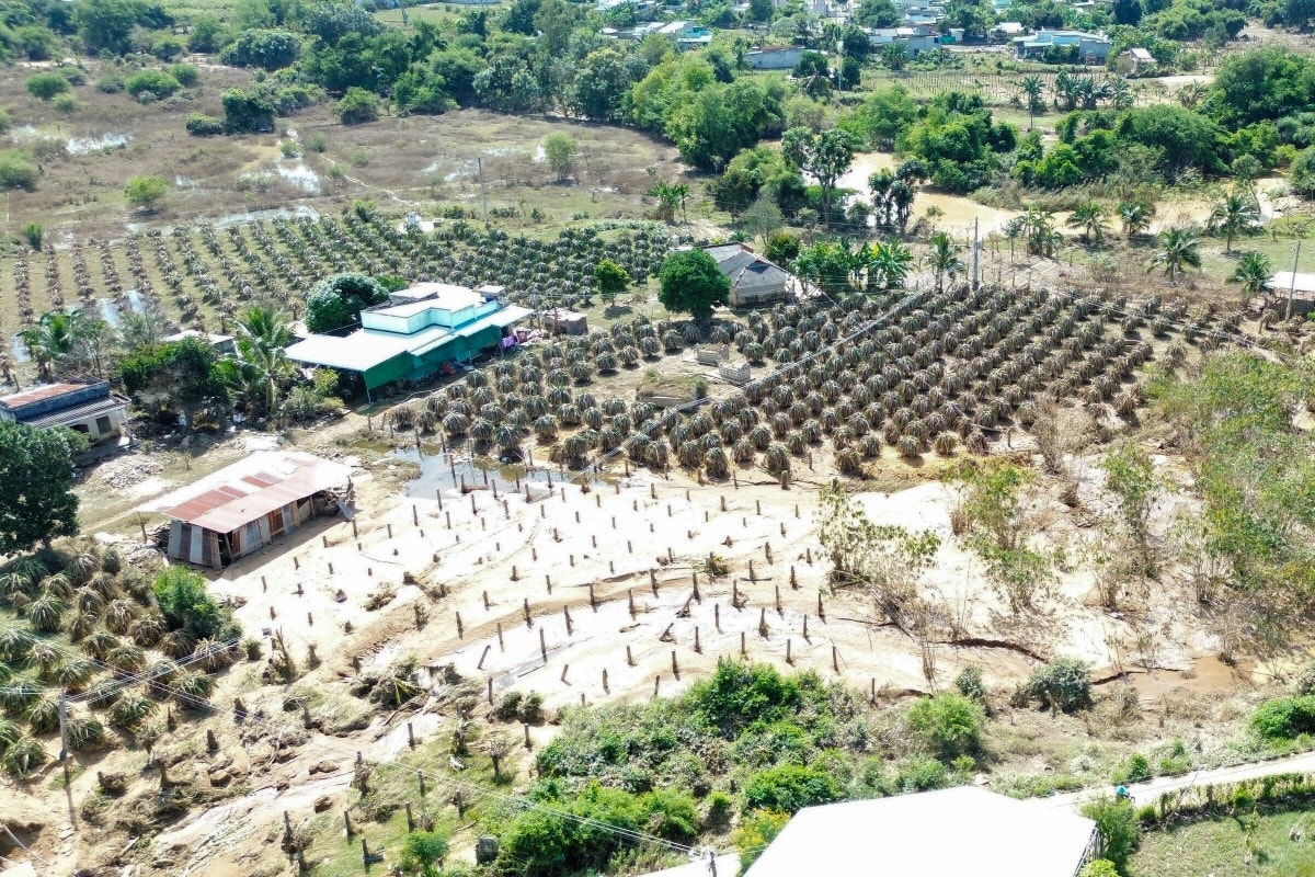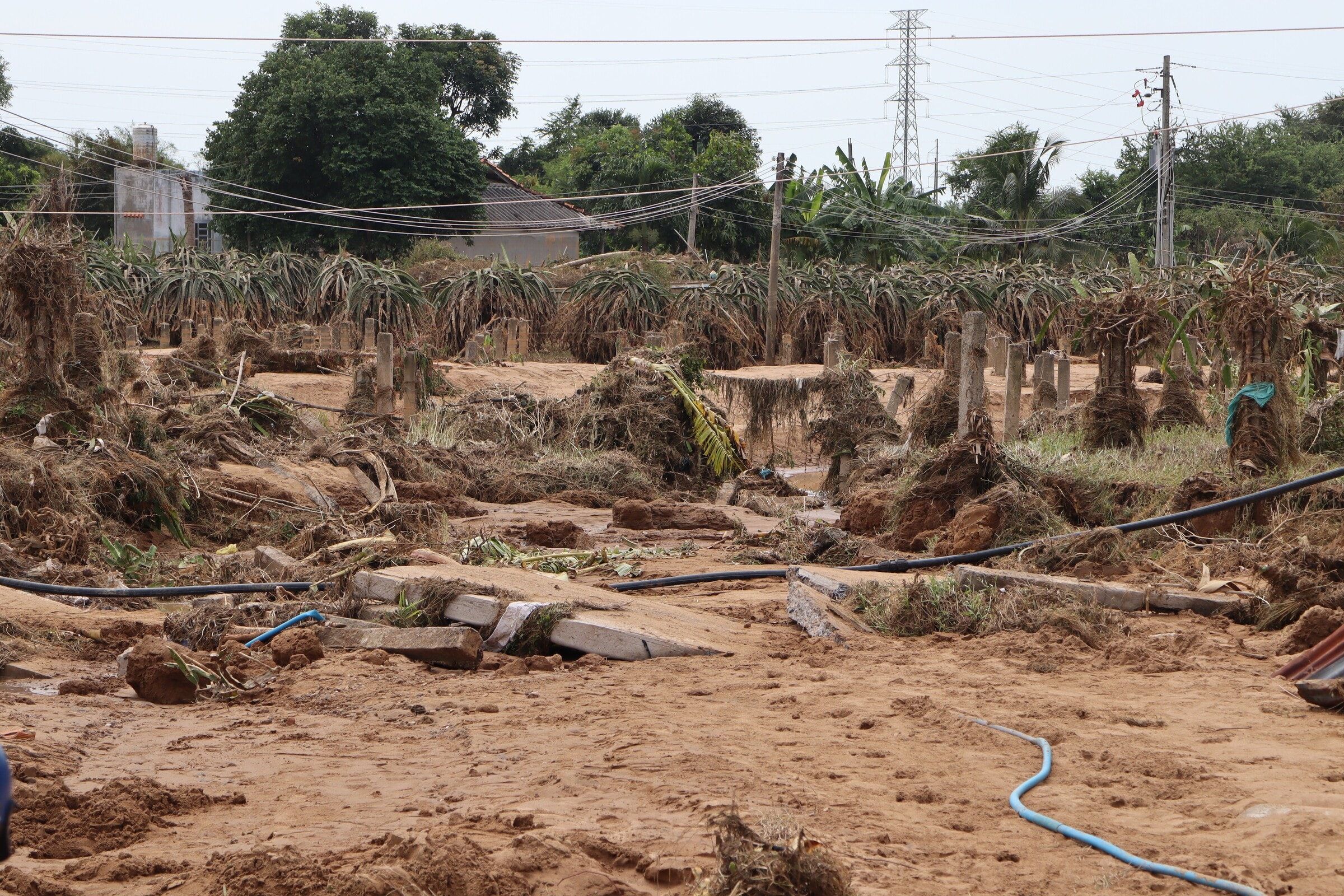Sau 3 ngày lũ rút, vùng trồng thanh long ven sông Cái (Bình Thuận cũ, nay là tỉnh Lâm Đồng) không còn nguyên vẹn như trước. Không ít vườn bị xói lở cuốn trôi đất, trụ trồng... Bùn lấm lem làm hư hại các vườn đang thu hoạch.