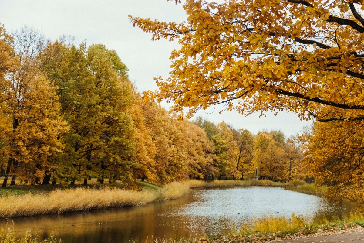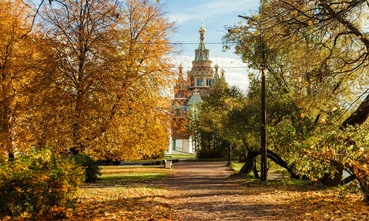 Lá vàng phủ kín thành phố Pushkin, Saint Petersburg.