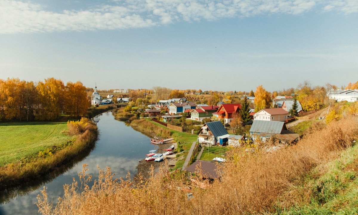 Vùng quê Suzdal trong sắc thu tháng 10. Suzdal là điểm nổi bật của vùng Vành đai Vàng, mang vẻ đẹp thanh bình của vùng quê Nga xưa.
