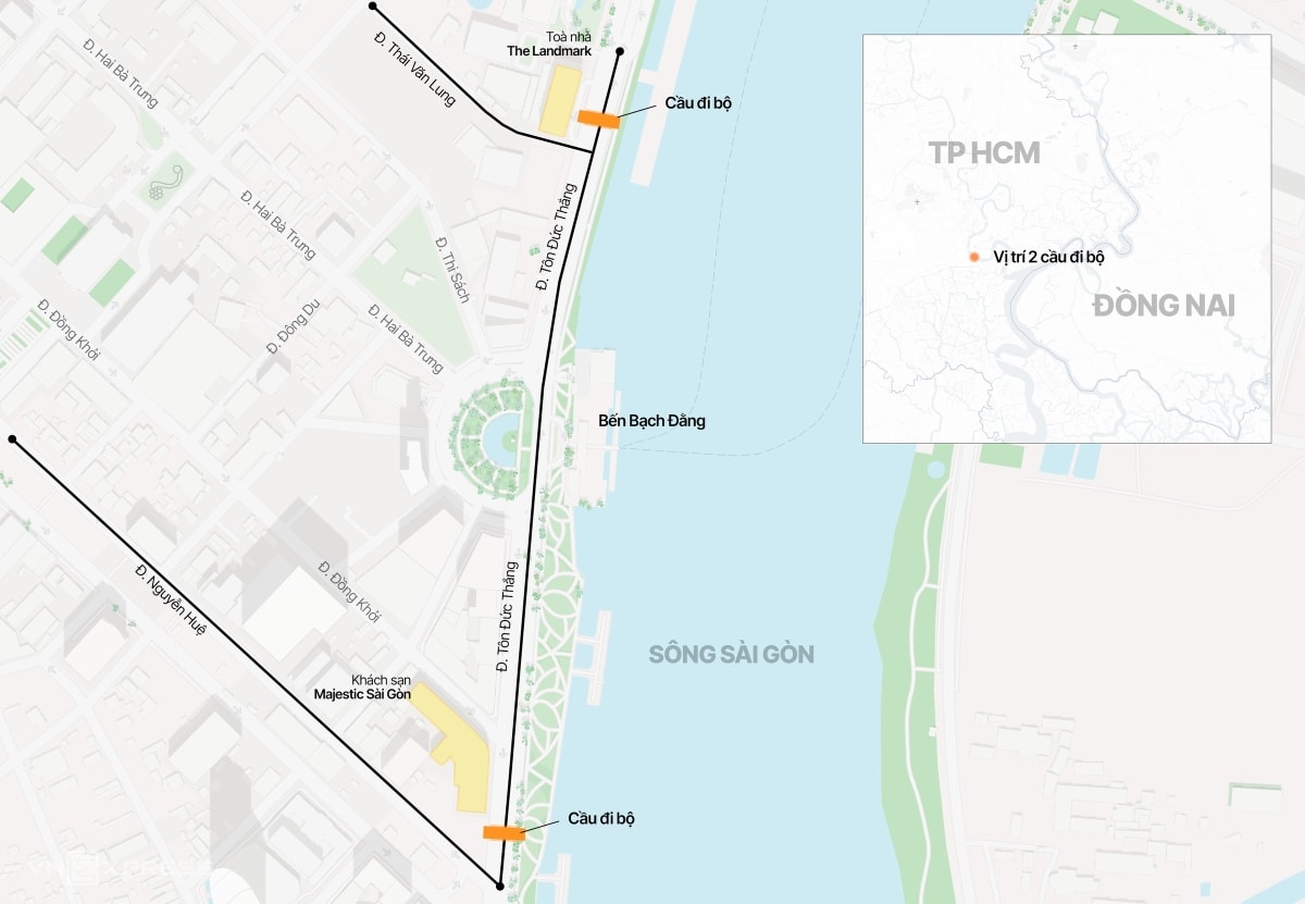 Hai cầu đi bộ nối phố Nguyễn Huệ và Thái Văn Lung sang bến Bạch Đằng được thiết kế hiện đại, thẩm mỹ, kỳ vọng góp phần làm đẹp không gian đô thị ven sông Sài Gòn.