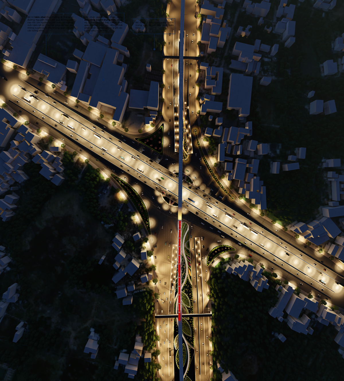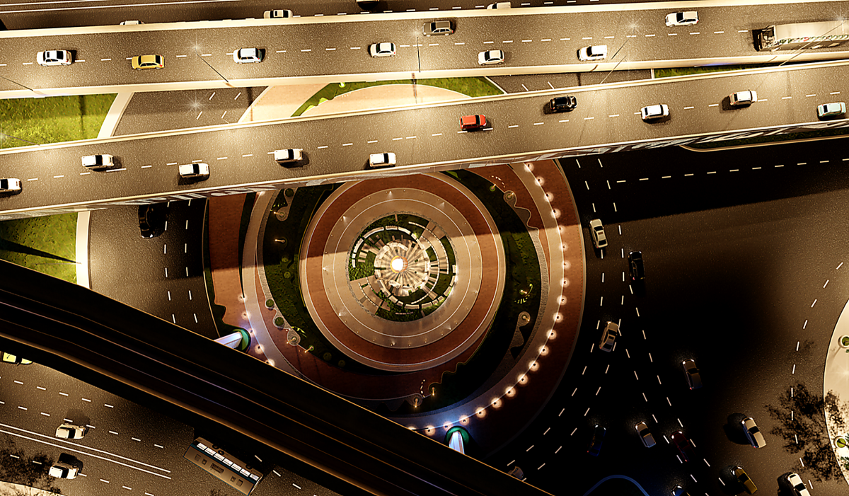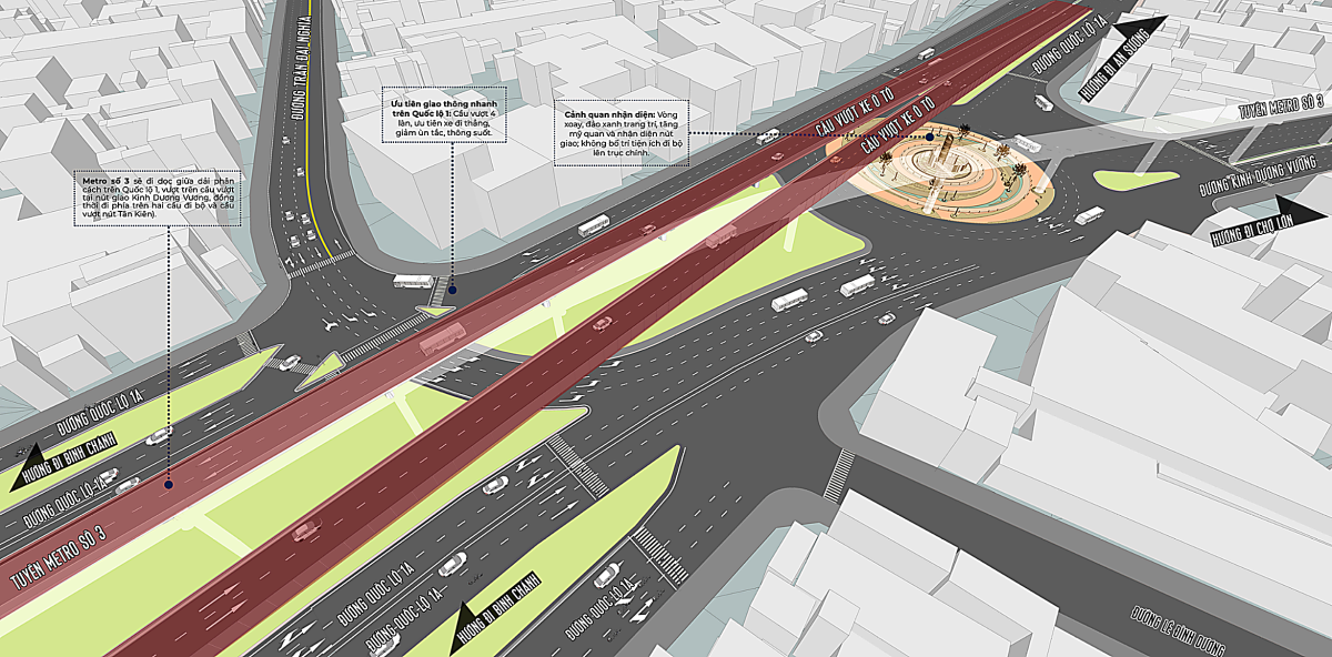 Cận cảnh thiết kế nút giao với đường Kinh Dương Vương. Ở nút giao này sẽ có cầu vượt, đảo tròn giúp giảm xung đột các hướng đi, kết hợp nhiều hạng mục cảnh quan xung quanh.