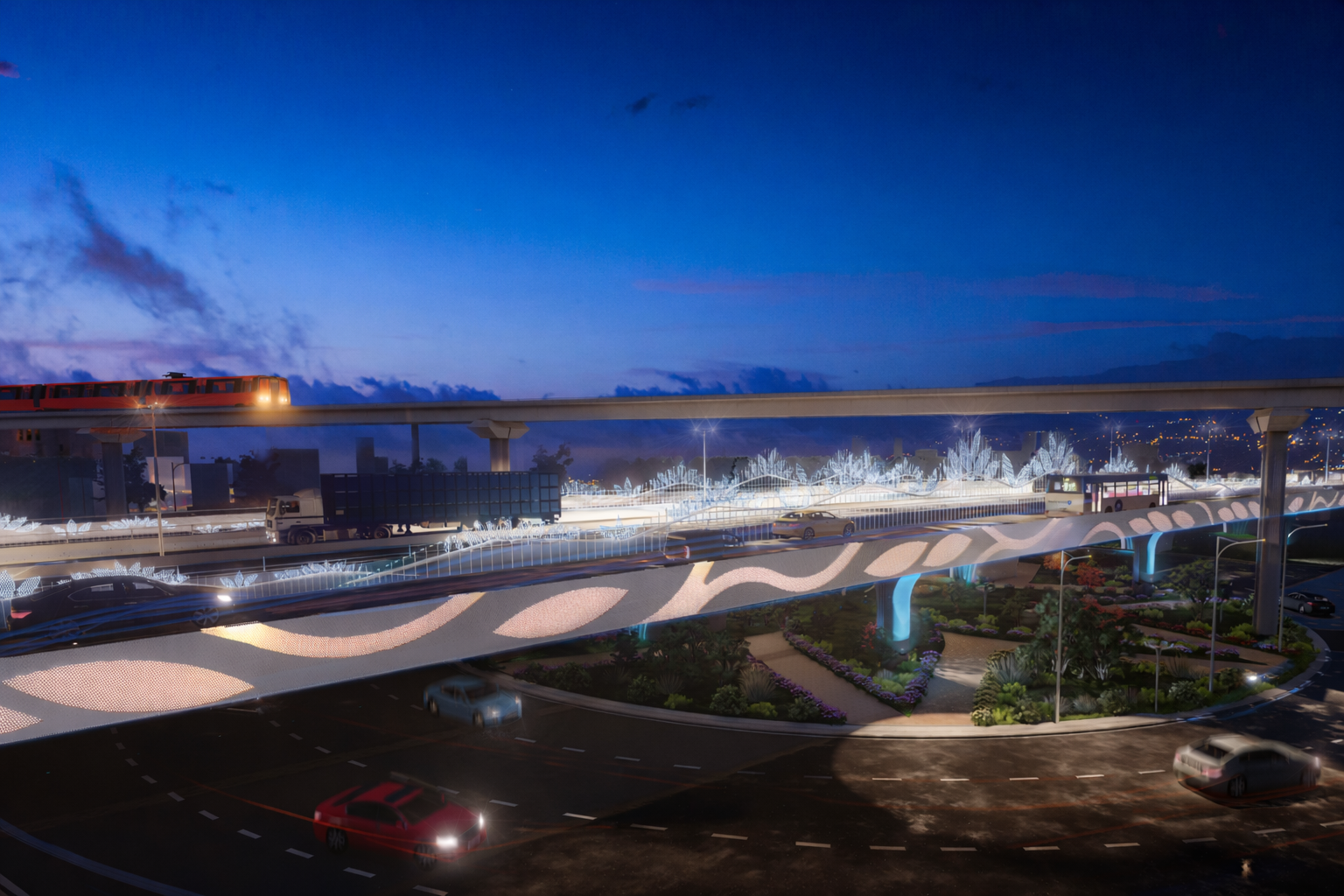 Vòng xoay phía dưới nút giao được thiết kế các hạng mục mỹ thuật nhằm tăng mỹ quan và tăng tính nhận diện. Trong đó, điểm nhấn ở khu vực này sẽ có trụ phát sáng, mang hình tượng vương miện của thủy tổ Kinh Dương Vương.