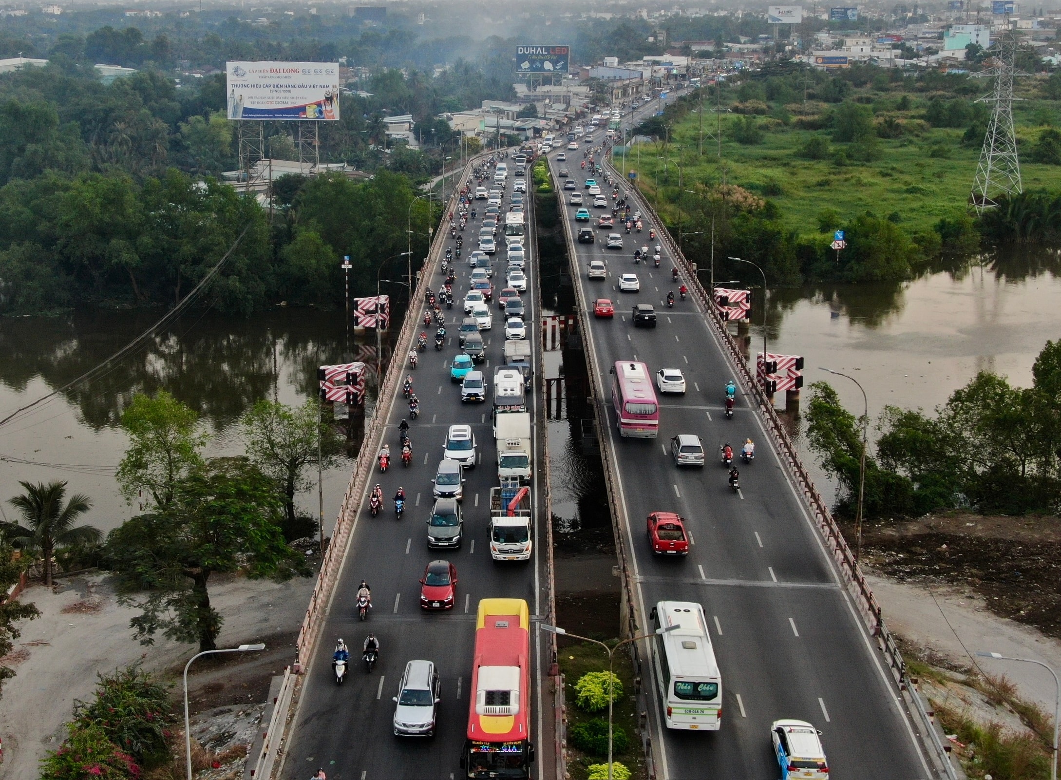 Dòng xe ùn ứ trên quốc lộ 1 đoạn qua cầu Bình Điền và nút giao Bình Thuận. Ảnh: Giang Anh