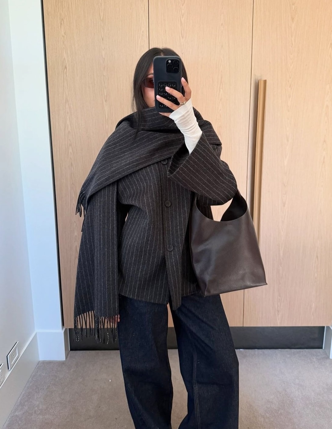 Các cô gái công sở còn được trải nghiệm mốt áo khoác kèm khăn tạo vẻ "giàu ngầm". Kiểu áo có phom dáng rộng, phần cổ nhiều lớp, phù hợp với những người có chiều cao tương đối trở lên.