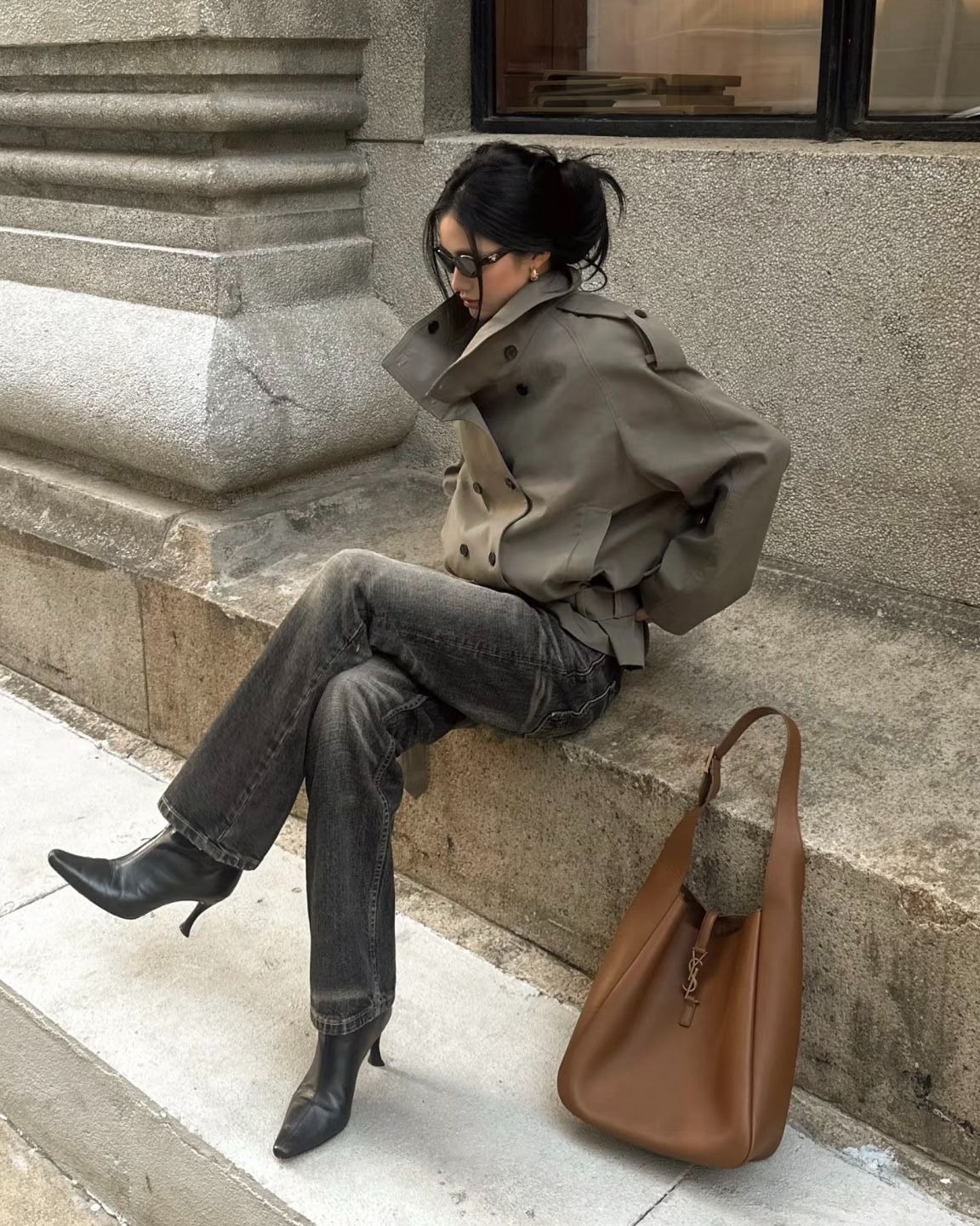 Mốt hot năm nay còn có trench coat ngắn. Bạn nên chọn thiết kế bằng len dày để giữ ấm, thay vì chất liệu kaki truyền thống thường được sử dụng trong mùa thu. Chỉ cần phối quần jeans và túi hobo, túi tote hoặc túi bowling, bạn đã có một bộ cánh thanh lịch và hút mắt ở văn phòng.