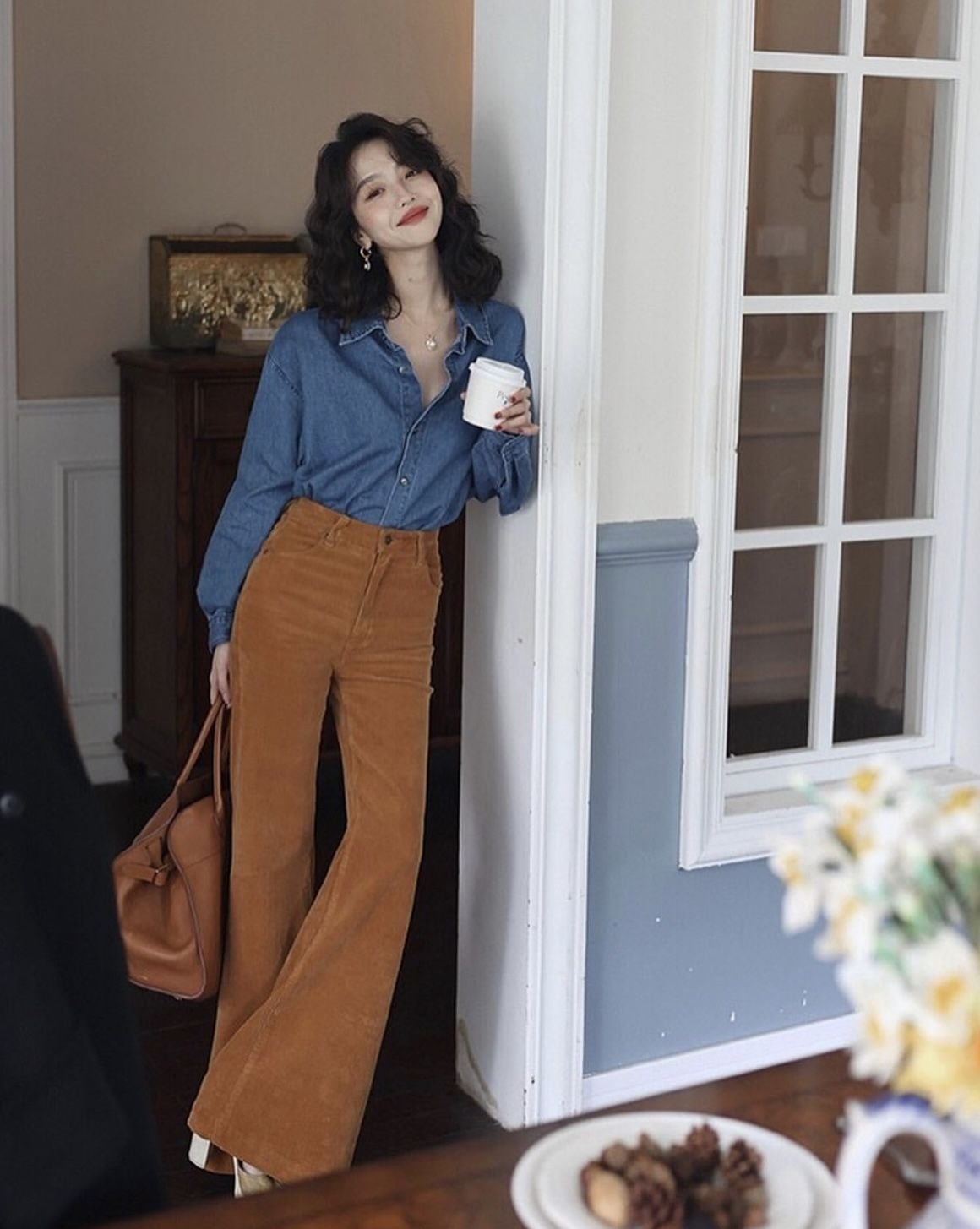 Thị trường năm nay còn đẩy mạnh quần nhung tăm thay cho quần jeans vì khả năng giữ ấm tốt hơn. Có hai dáng phổ biến cho bạn lựa chọn: ống loe giúp "kéo dài" chân và xếp ly ống rộng tạo vẻ phóng khoáng.
