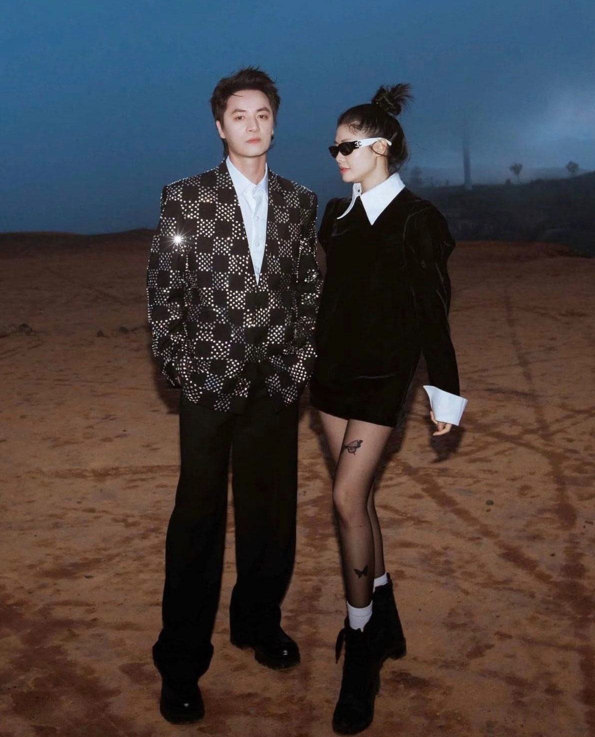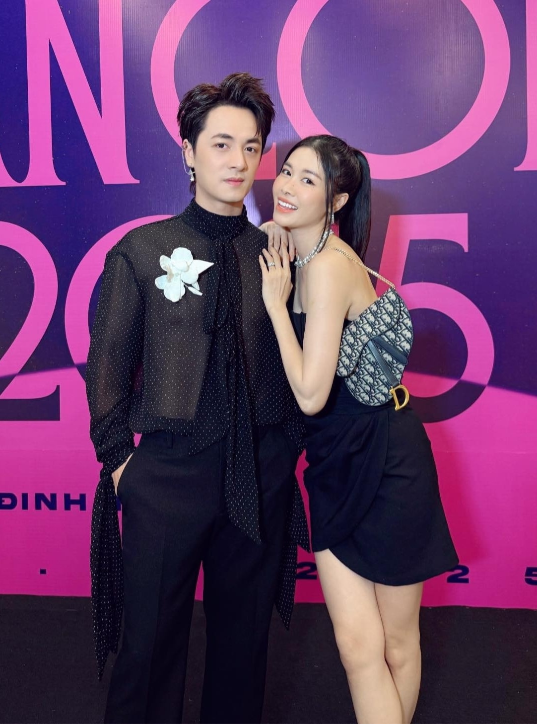 Ở một sự kiện khác, cả hai cùng diện sắc đen và sơ mi trắng. Trong khi Đăng Khôi kết hợp blazer và quần Tây, Thủy Anh chọn sơ mi làm điểm nhấn cho váy nhung đen dáng suông.