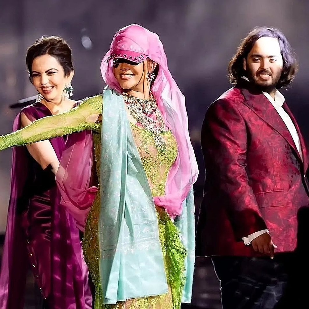 Tháng 3/2024, Rihanna gây bất ngờ khi góp mặt trong tiệc của gia đình Ambani tại thành phố Jamnagar (Ấn Độ). Theo Independent, cô nhận gần bảy triệu USD cho 40 phút biểu diễn. Ca sĩ đi chân trần trên sân khấu, thể hiện các ca khúc Consideration, Birthday Cake, Pose và nhảy múa cùng gia đình cô dâu chú rể. Từ trái qua: Vợ ông Mukesh - bà Nita, Rihanna và Anant Ambani. Ảnh: ANI