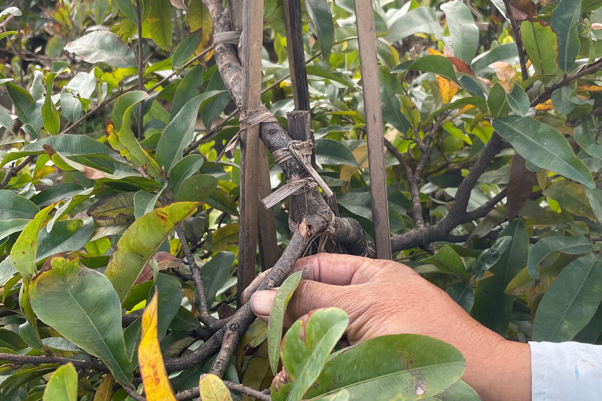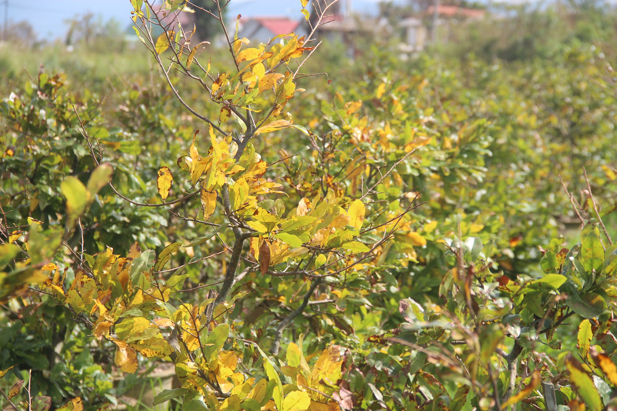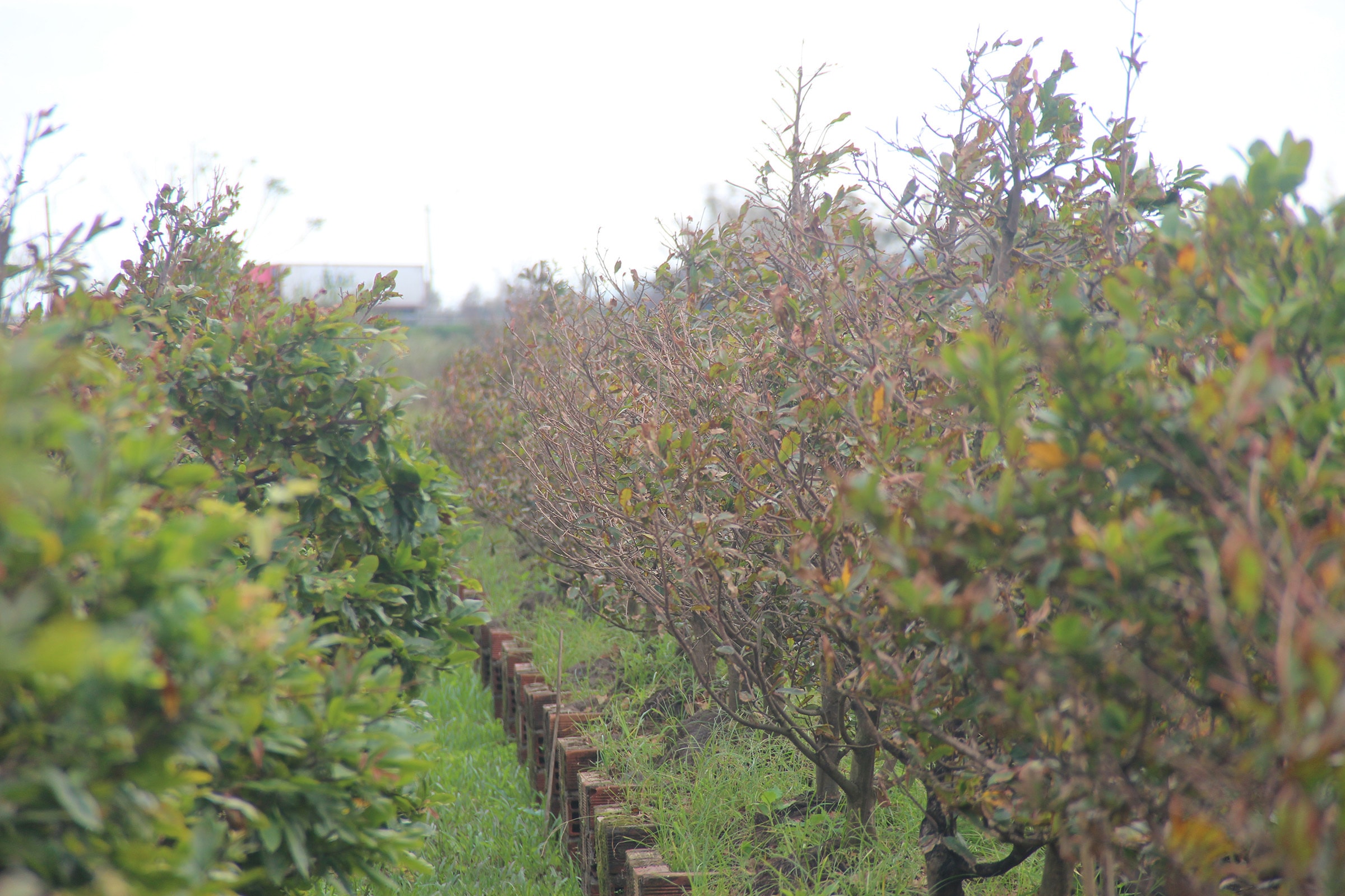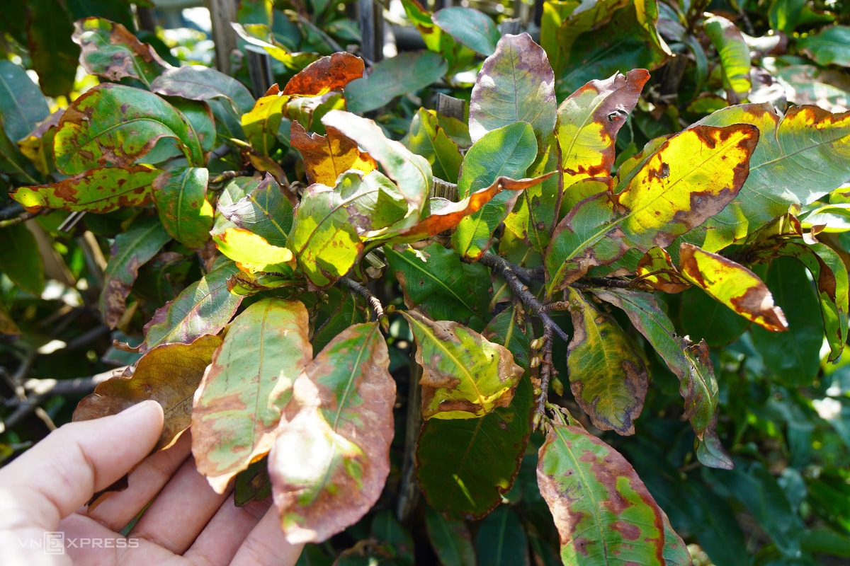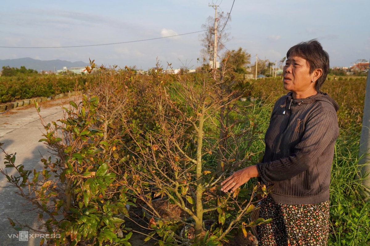 Cách thôn Háo Đức hơn 2 km, vườn hơn 10.000 gốc mai của bà Trần Thị Kim Hà, 58 tuổi, ở thôn Trung Lý, phường An Nhơn Bắc, cũng héo rũ, cành khô quắt. Sau bão, nắng gắt khiến cây suy kiệt, nhiều gốc có dấu hiệu chết dần. Vốn liếng hàng tỷ đồng và khoản nợ ngân hàng lớn của gia đình đều trông vào vụ hoa Tết.