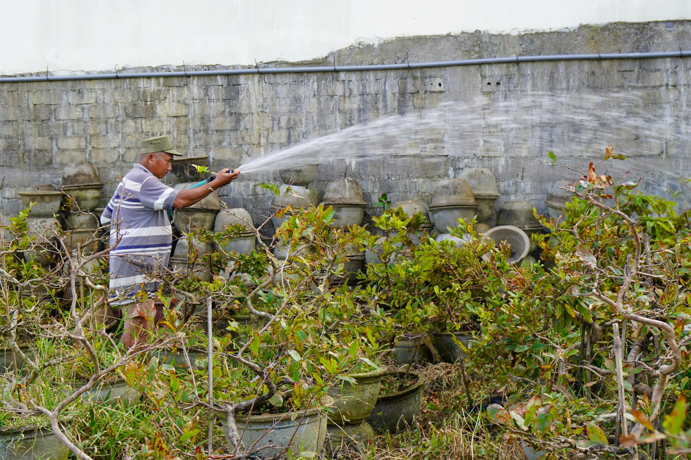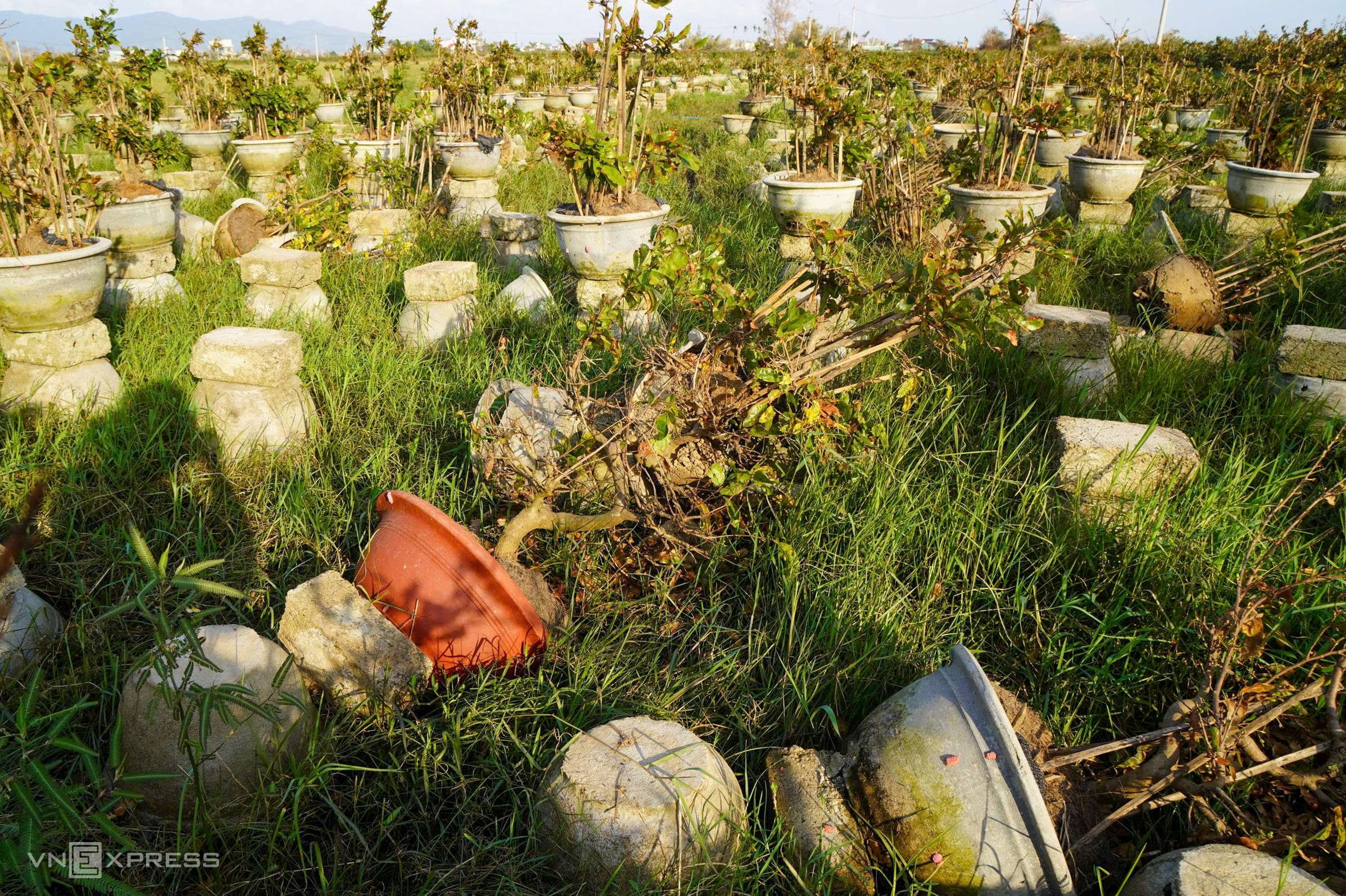 Cạnh vườn ông Phụng, bà Phan Thị Hiệp (44 tuổi) tất bật cứu 2.000 chậu mai 3-5 năm tuổi. Hàng loạt cây héo rũ, cháy lá, ngã đổ xuống ruộng. Trong lúc tưới, gặp chậu bị ngập hoặc đổ, bà Hiệp lập tức bưng lên kê chỗ cao để tránh thối rễ, cứu cây.