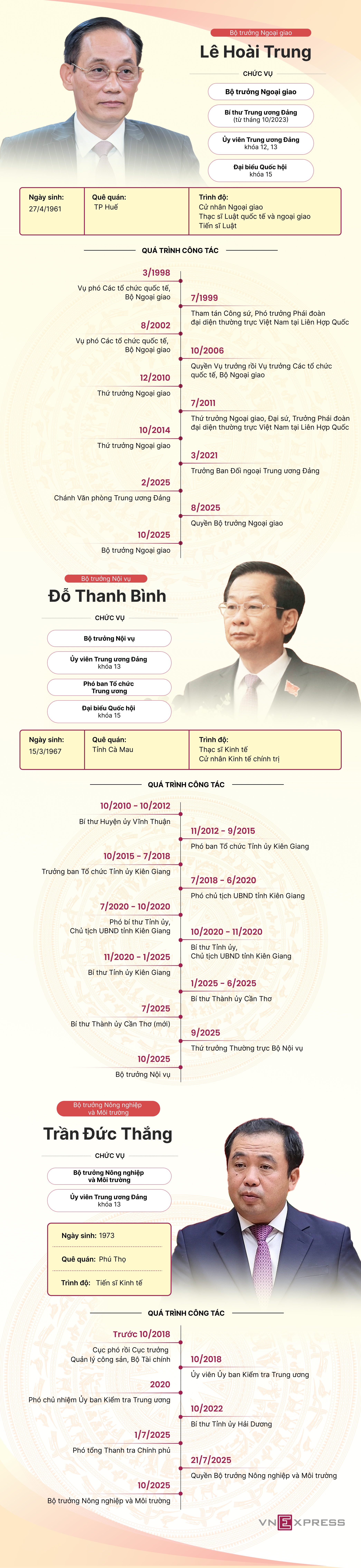 Bộ trưởng Lê Hoài Trung có nhiều năm công tác trong ngành ngoại giao, từng là Trưởng ban Đối ngoại Trung ương; Bộ trưởng Đỗ Thanh Bình từng giữ chức Bí thư Tỉnh ủy Kiên Giang và Bí thư Thành ủy Cần Thơ; Bộ trưởng Trần Đức Thắng từng là Phó chủ nhiệm Ủy ban Kiểm tra Trung ương, Bí thư Tỉnh ủy Hải Dương.