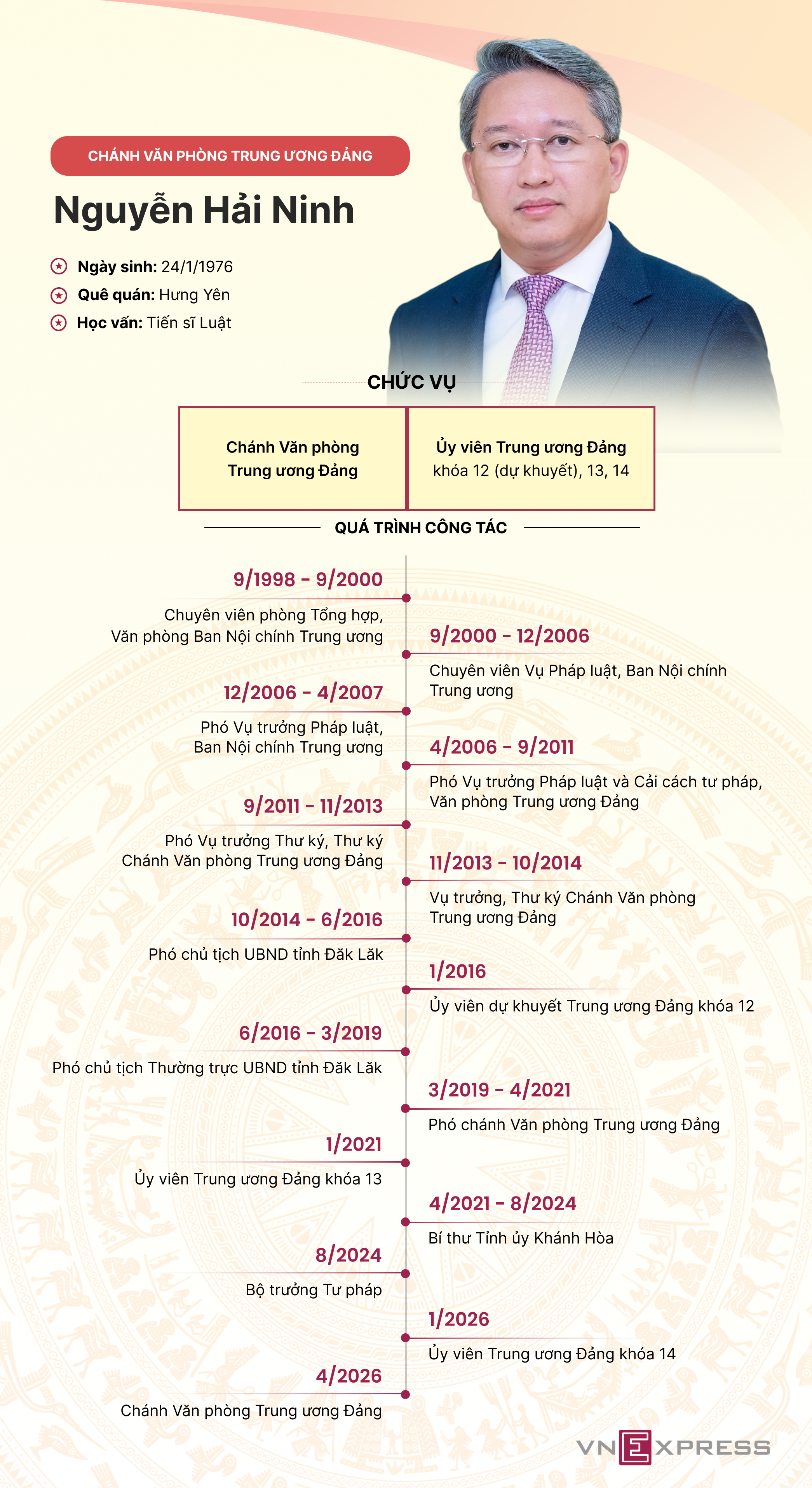 Chánh Văn phòng Trung ương Đảng Nguyễn Hải Ninh 50 tuổi, từng làm Bí thư Tỉnh ủy Khánh Hòa 3 năm, Bộ trưởng Tư pháp 2 năm.