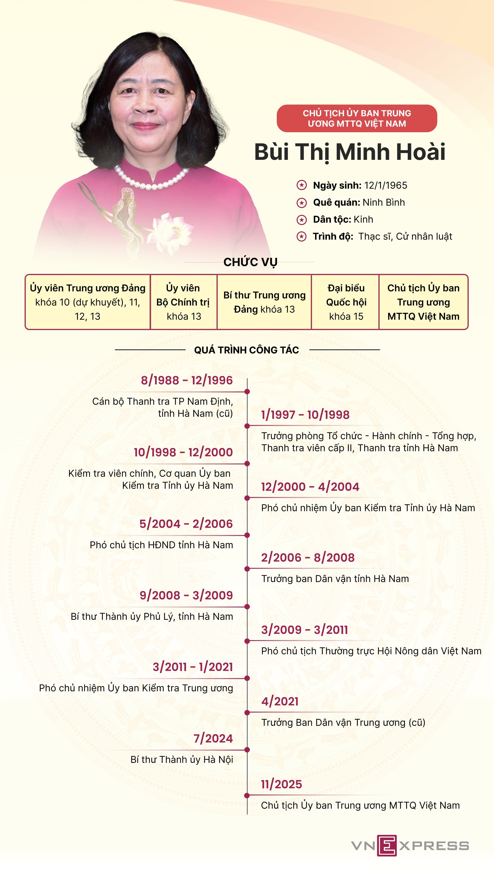 Bà Bùi Thị Minh Hoài từng làm Phó chủ nhiệm Ủy ban Kiểm tra Trung ương, Trưởng ban Dân vận Trung ương, Bí thư Thành ủy Hà Nội trước khi giữ chức Chủ tịch Ủy ban Trung ương Mặt trận Tổ quốc Việt Nam.