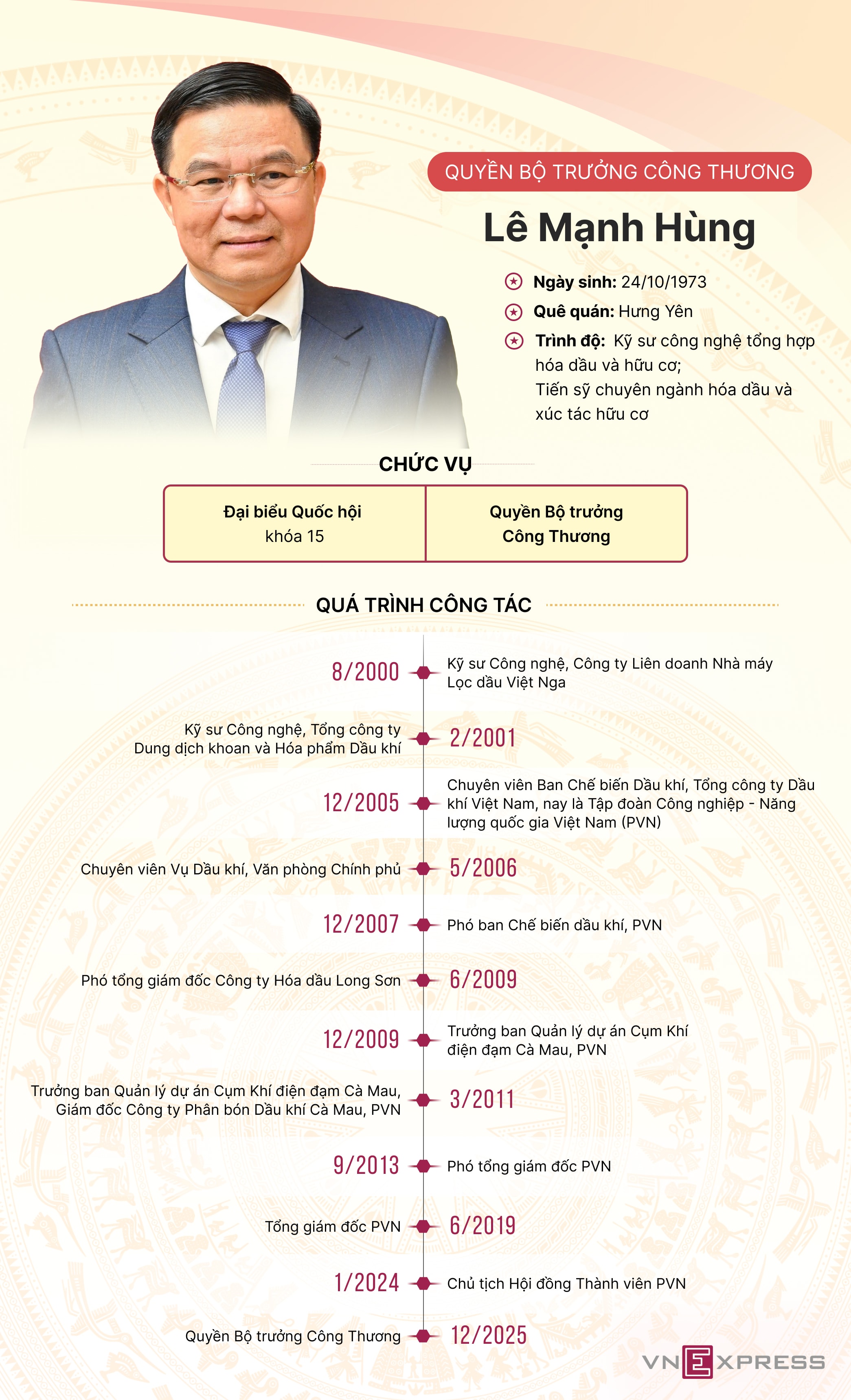 Trước khi được giao quyền Bộ trưởng Công Thương, ông Lê Mạnh Hùng có 25 năm gắn bó với ngành dầu khí, từng làm Chủ tịch Hội đồng Thành viên, Tổng giám đốc PVN.