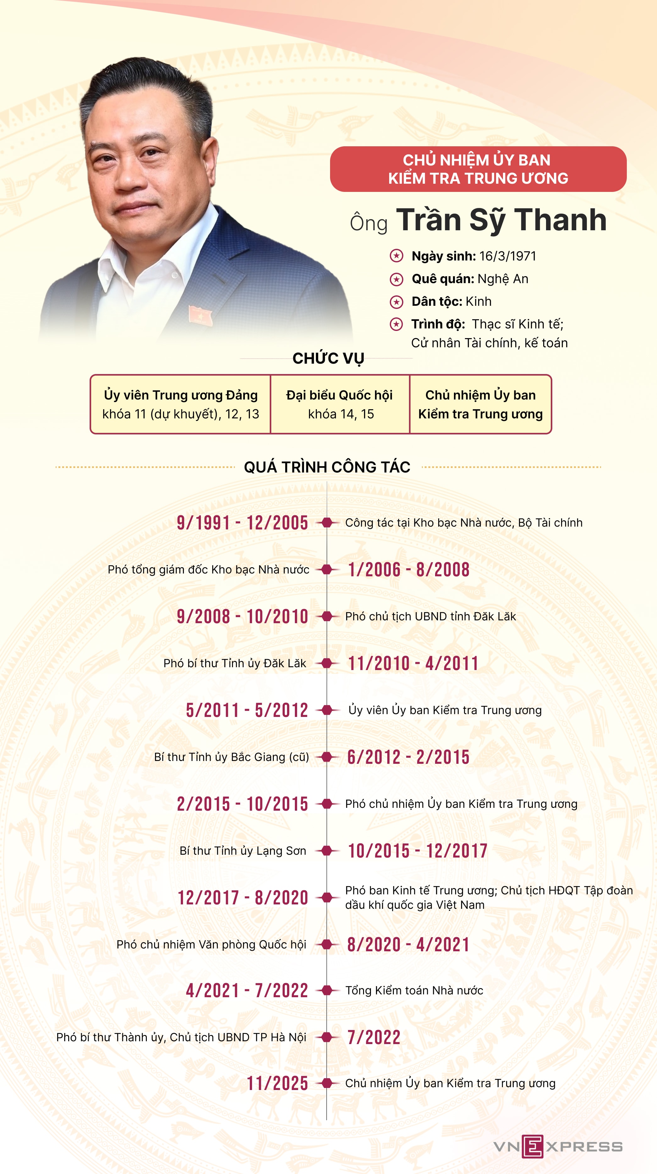 Ông Trần Sỹ Thanh từng làm Phó chủ nhiệm Văn phòng Quốc hội, Tổng Kiểm toán Nhà nước, Chủ tịch Hà Nội, trước khi giữ chức Chủ nhiệm Ủy ban Kiểm tra Trung ương.
