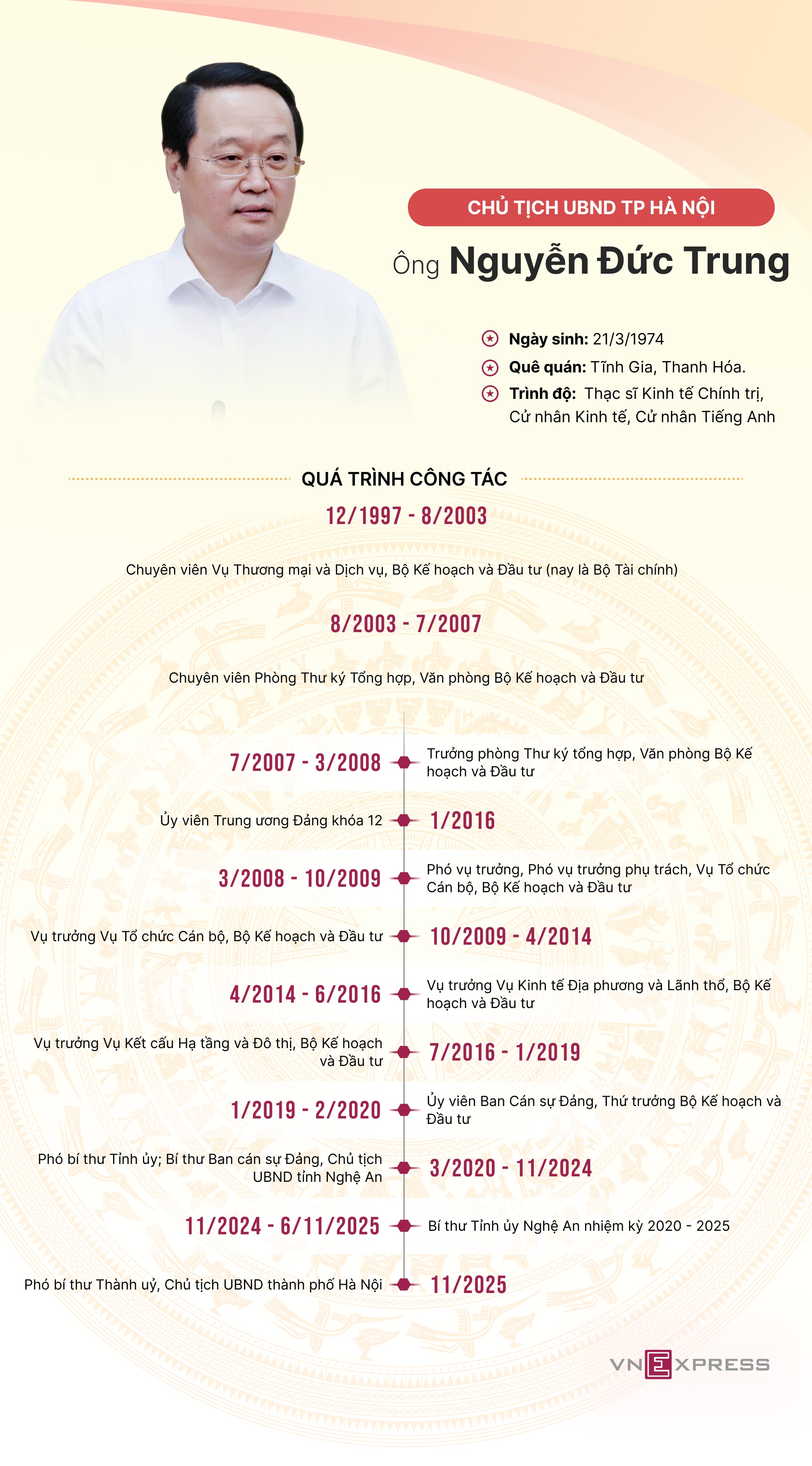 Ông Nguyễn Đức Trung có hơn 20 năm công tác tại Bộ Kế hoạch và Đầu tư, từng giữ chức Thứ trưởng Bộ này, sau đó làm Bí thư Tỉnh ủy, Chủ tịch UBND tỉnh Nghệ An trước khi được bầu Chủ tịch Hà Nội.