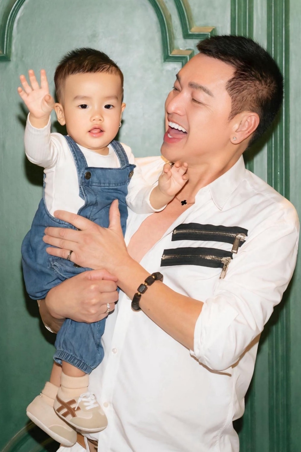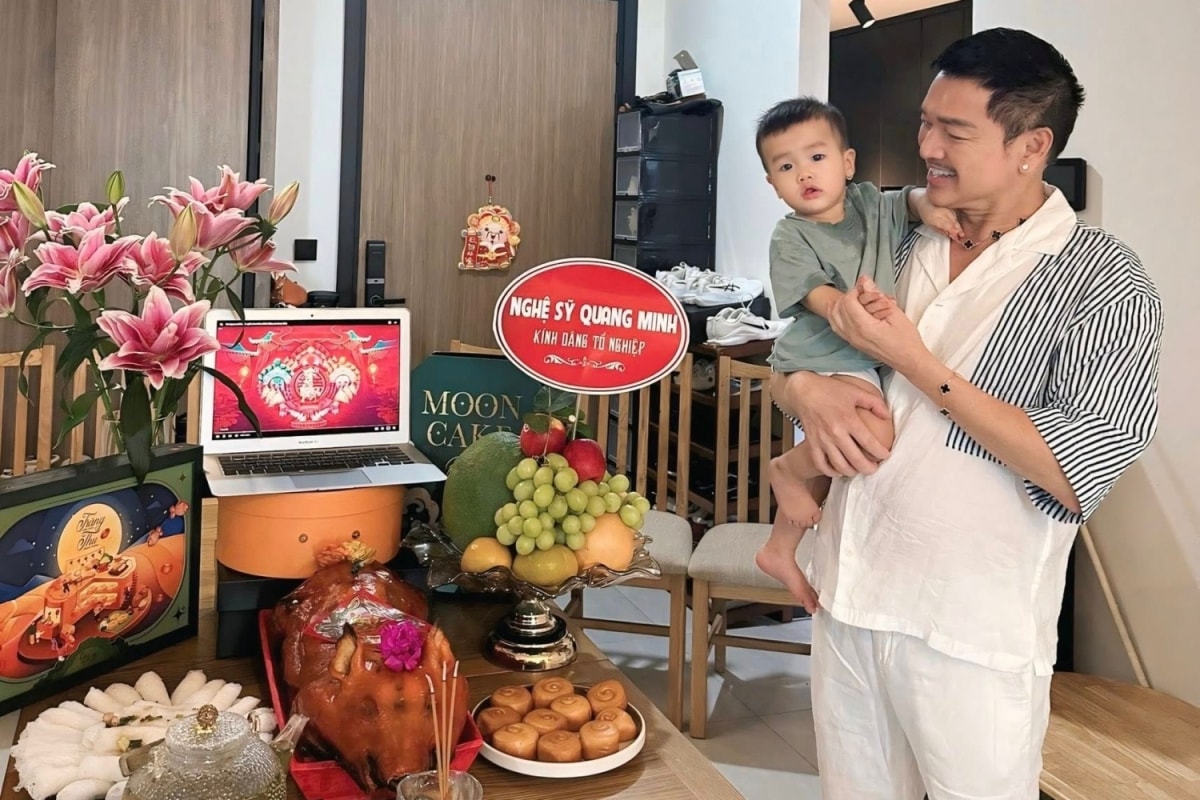 Diễn viên bên con trai trong lễ cúng tổ nghề sân khấu (12/8 âm lịch) vào đầu tháng 10, tại TP HCM. Anh nói không cầu mong gì nhiều, chỉ hy vọng con luôn khỏe mạnh, bản thân có thêm nhiều cơ hội phục vụ khán giả.