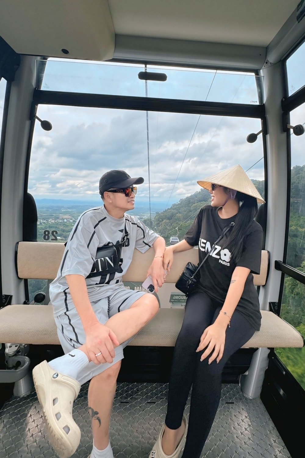 Cả hai ngắm cảnh khi đi cáp treo tại núi Chứa Chan. Sánh đôi cùng bạn gái, diễn viên thường được khen về phong cách trẻ trung. Anh chuộng những kiểu dáng phóng khoáng như áo thun phom rộng, quần baggy hoặc quần shorts, phối cùng mũ lưỡi trai và kính màu.