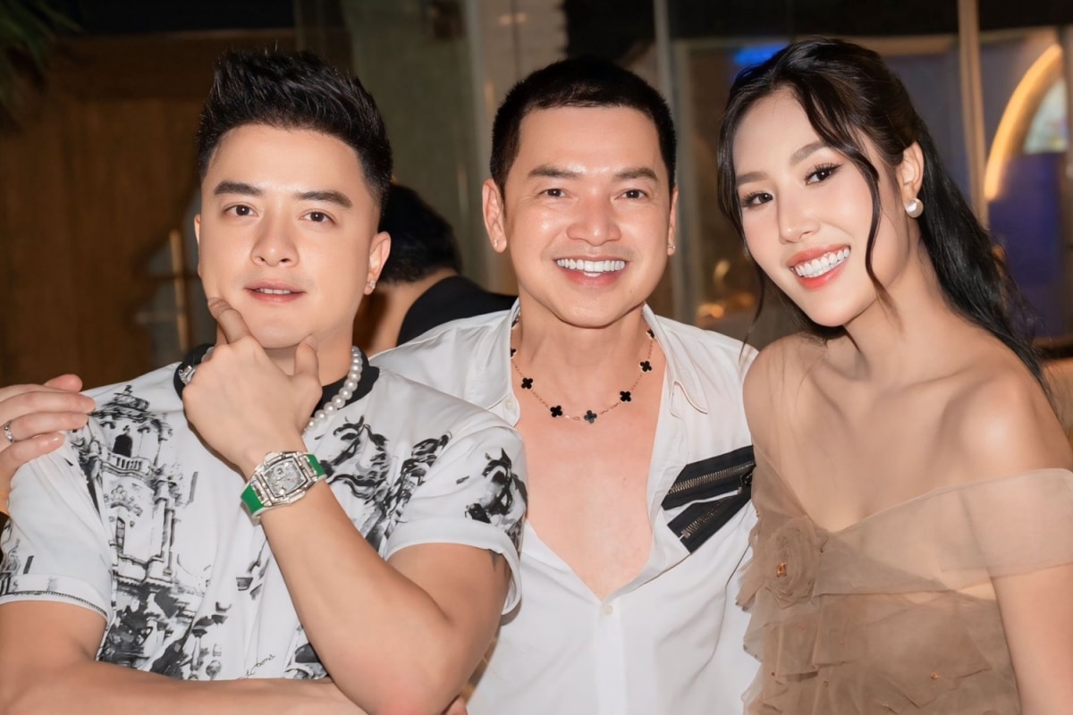 Quang Minh bên Cao Thái Sơn - nghệ sĩ thân thiết với gia đình anh - trong tiệc sinh nhật anh tổ chức cho bạn gái vào tháng 8.