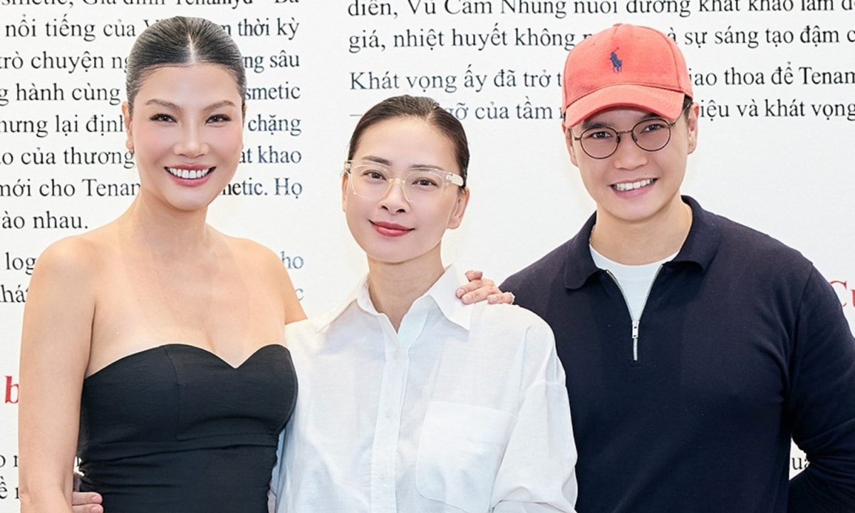 Cuối tháng 10, cô bắt đầu dự sự kiện trở lại sau sinh, hội ngộ cựu người mẫu Vũ Cẩm Nhung (trái) ở một triển lãm tại TP HCM. Cô dự tính rời nghiệp diễn xuất trong hai, ba năm để dành trọn thời gian cho gia đình nhỏ.