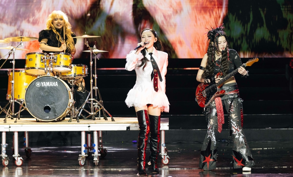 Tóc Tiên cùng dàn "Em xinh" thể hiện bản mashup "Rock thiệp hồng" còn Phương Mỹ Chi diễn sung bài "Ếch ngoài đáy giếng" ở Làn Sóng Xanh 2025.