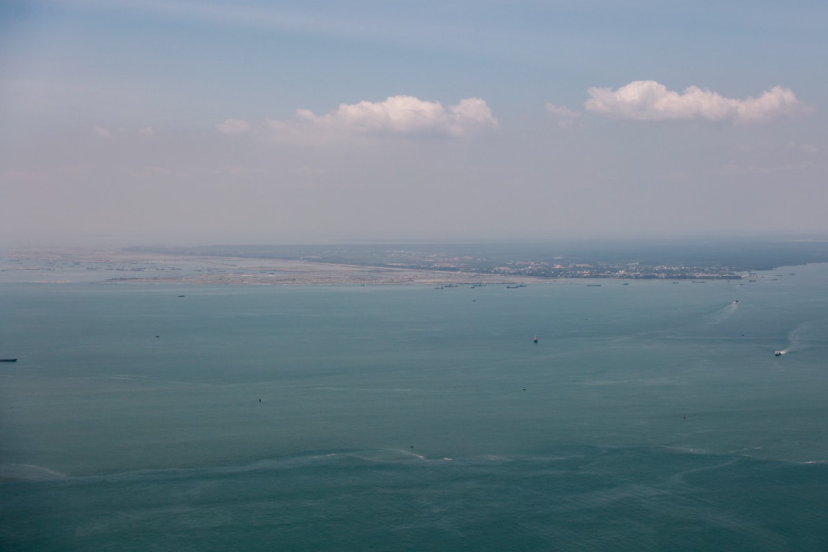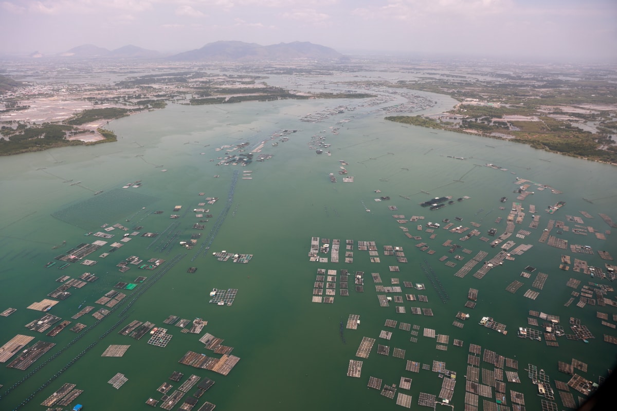 Các lồng bè ở xã Long Sơn, phía xa là khu vực Cần Giờ được nhìn khá rõ. Trực thăng không bay quá nhanh và cao giúp du khách dễ ngắm nhìn.