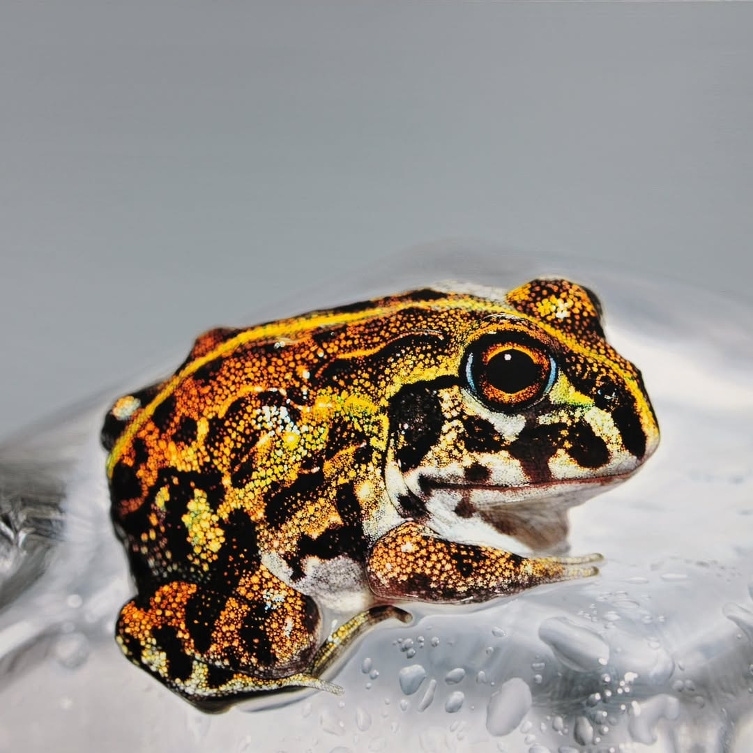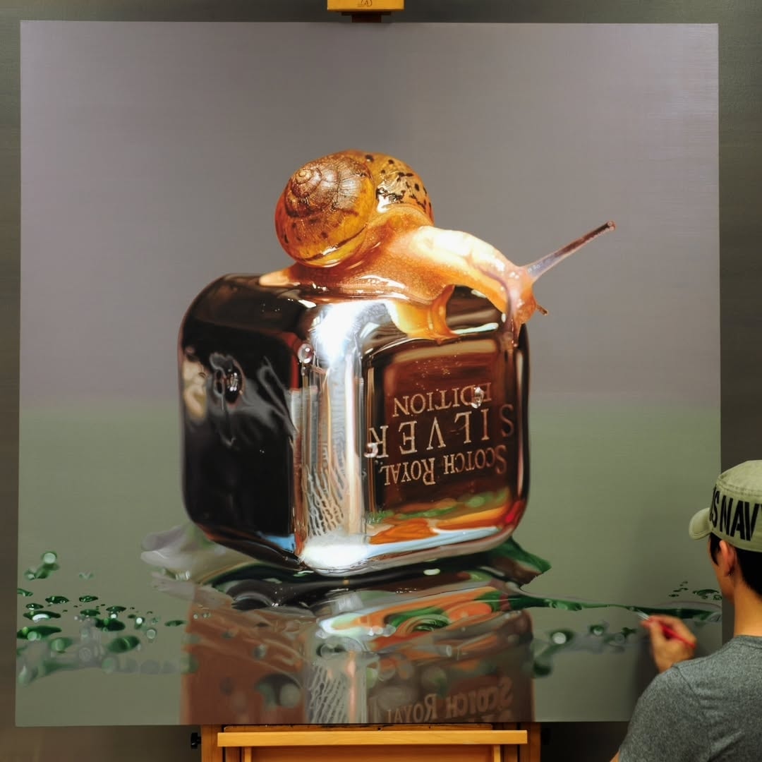 Loài vật trong tranh của Kim Young-sung được khắc họa chi tiết, tỉ mỉ. Tác phẩm ốc sên đang bò trên một khối kim loại này từng xuất hiện ở triển lãm của họa sĩ tại Seoul, Hàn Quốc, hồi tháng 11/2025.