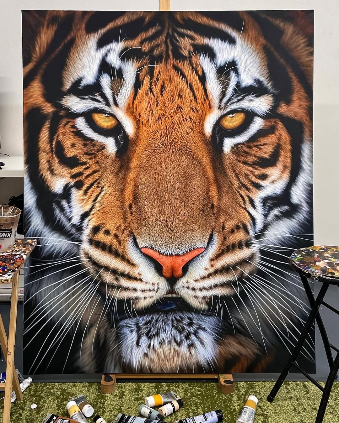 Họa sĩ người Canada Nick Sider, 38 tuổi, nổi tiếng với những bức họa về các loài thú dữ như sư tử, hổ, báo. Anh sử dụng acrylic, chất liệu dễ khô, có thể nhanh chóng vẽ chồng nhiều lớp nhằm tạo hiệu ứng. Mỗi bức, họa sĩ thường mất vài tuần để hoàn thành.