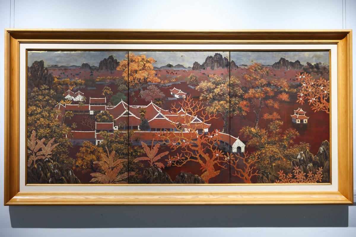 Với chiều dài gần hai mét, bức sơn mài Chùa Thầy của Trần Phúc Duyên là một trong những tác phẩm có kích thước lớn tại triển lãm.