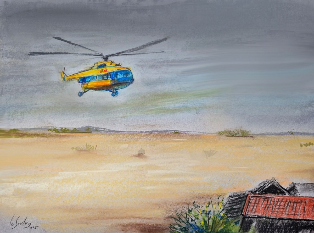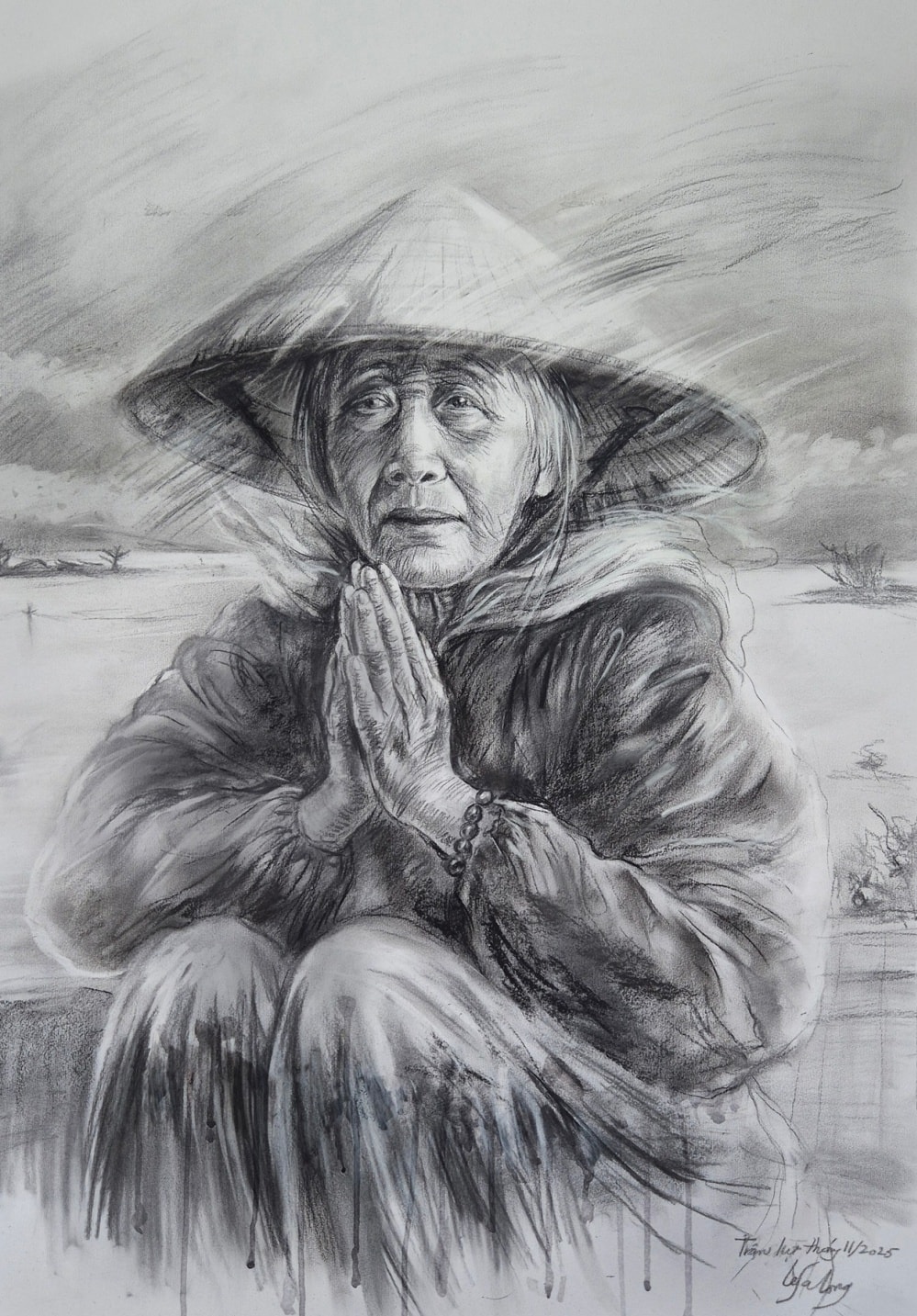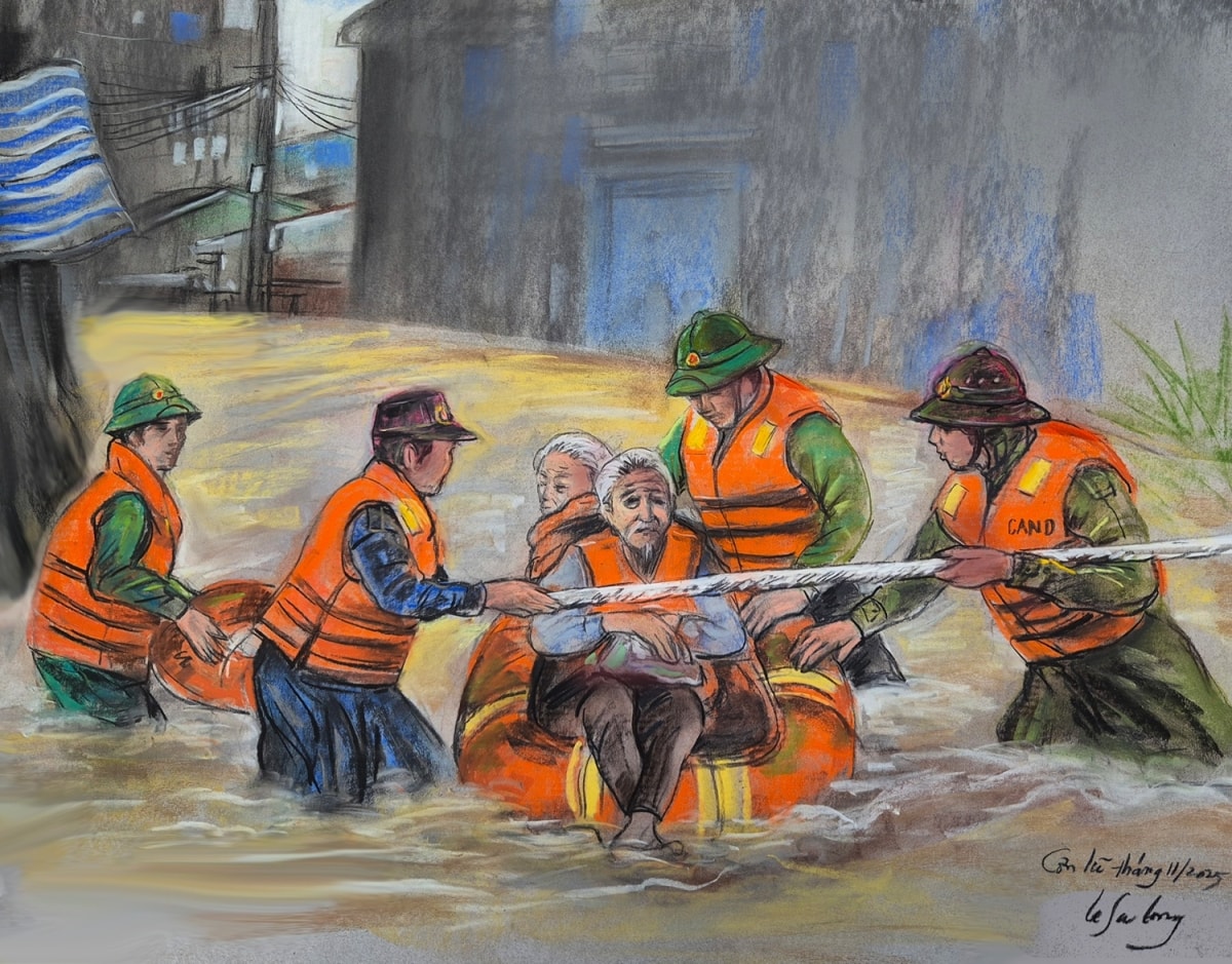 Cảnh cụ già được đưa khỏi nhà bị ngập nóc, những đoàn xe cứu trợ về miền Trung, được họa sĩ Lê Sa Long khắc họa.