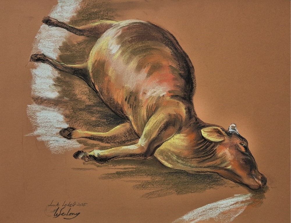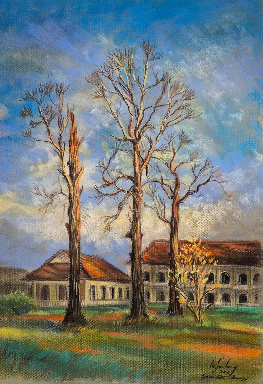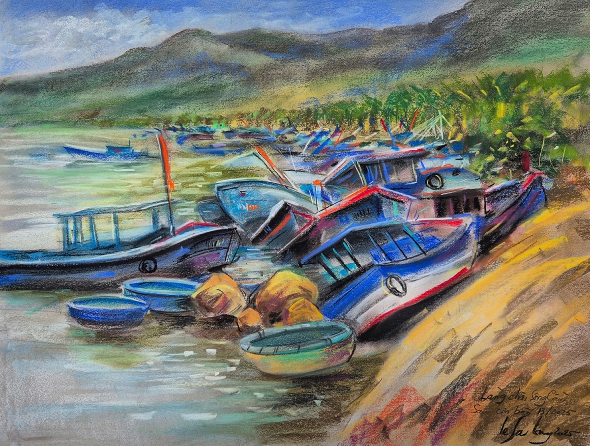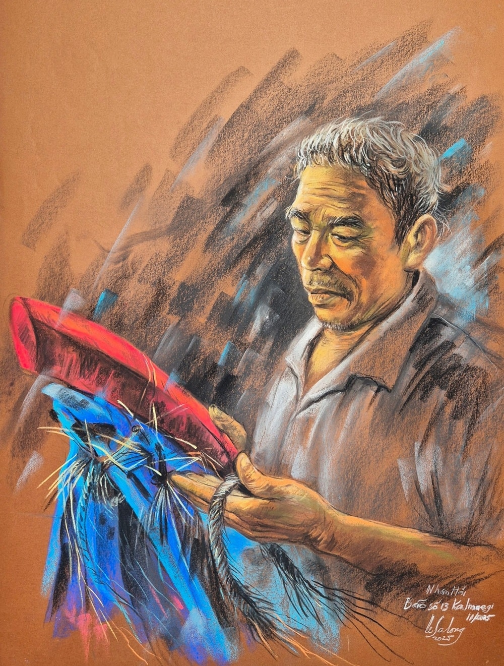 Cảnh cụ già được đưa khỏi nhà bị ngập nóc, những đoàn xe cứu trợ về miền Trung, được họa sĩ Lê Sa Long khắc họa.