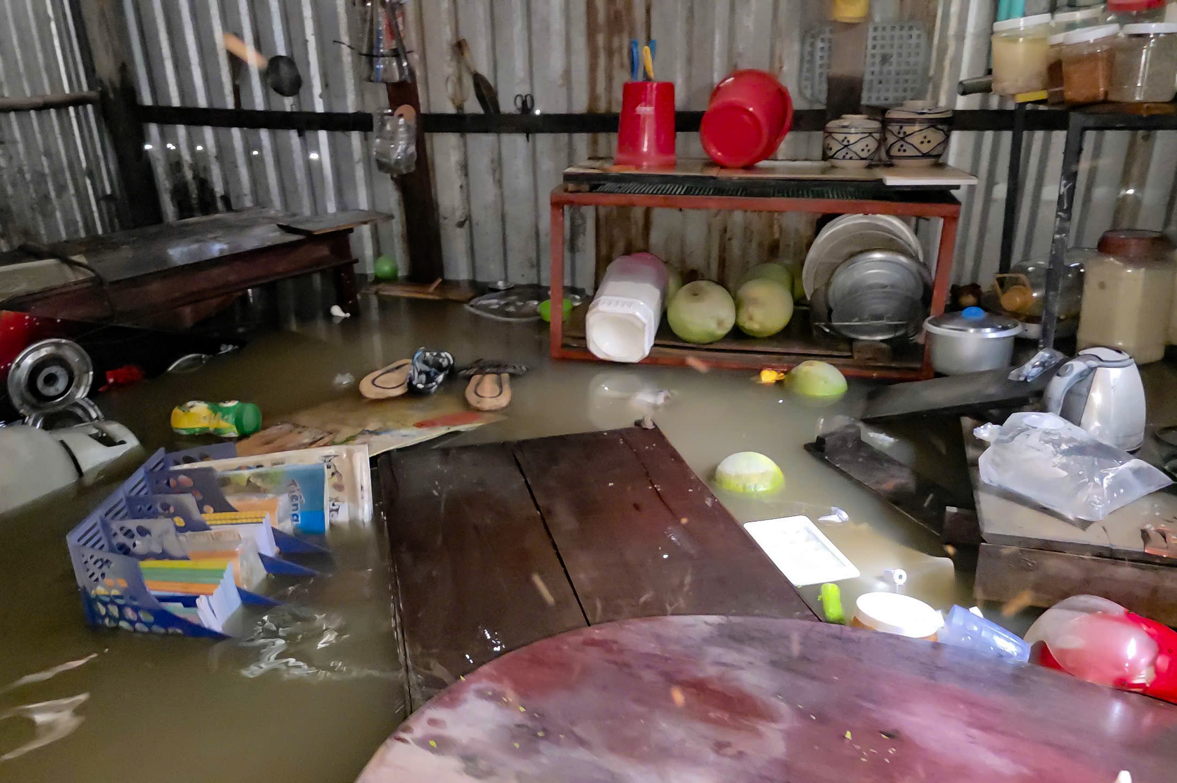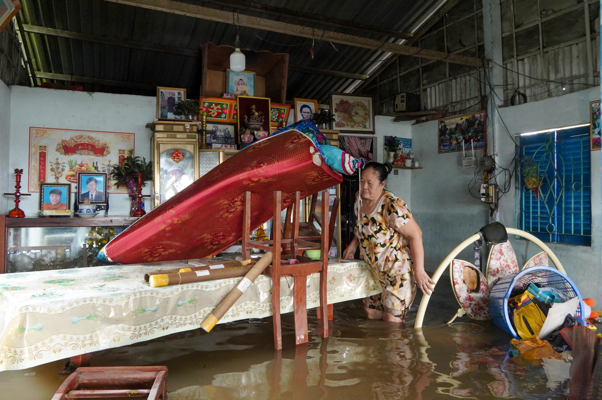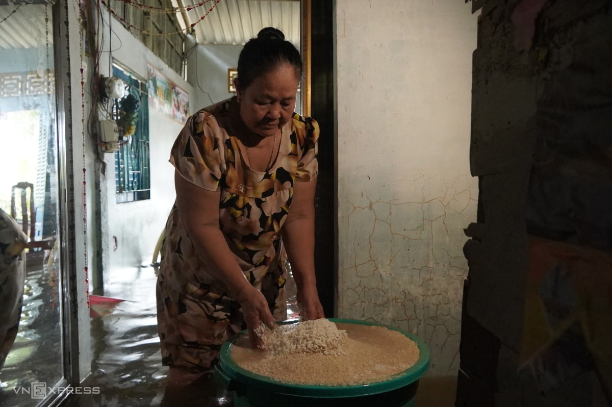 Bà Dung bên thùng gạo hơn 30 kg dự trữ của gia đình bị ngập nước. "Nước tràn vào nhà nhanh quá, tôi cùng con gái không thu dọn nhiều đồ đạc lên nơi khô ráo", bà nói.