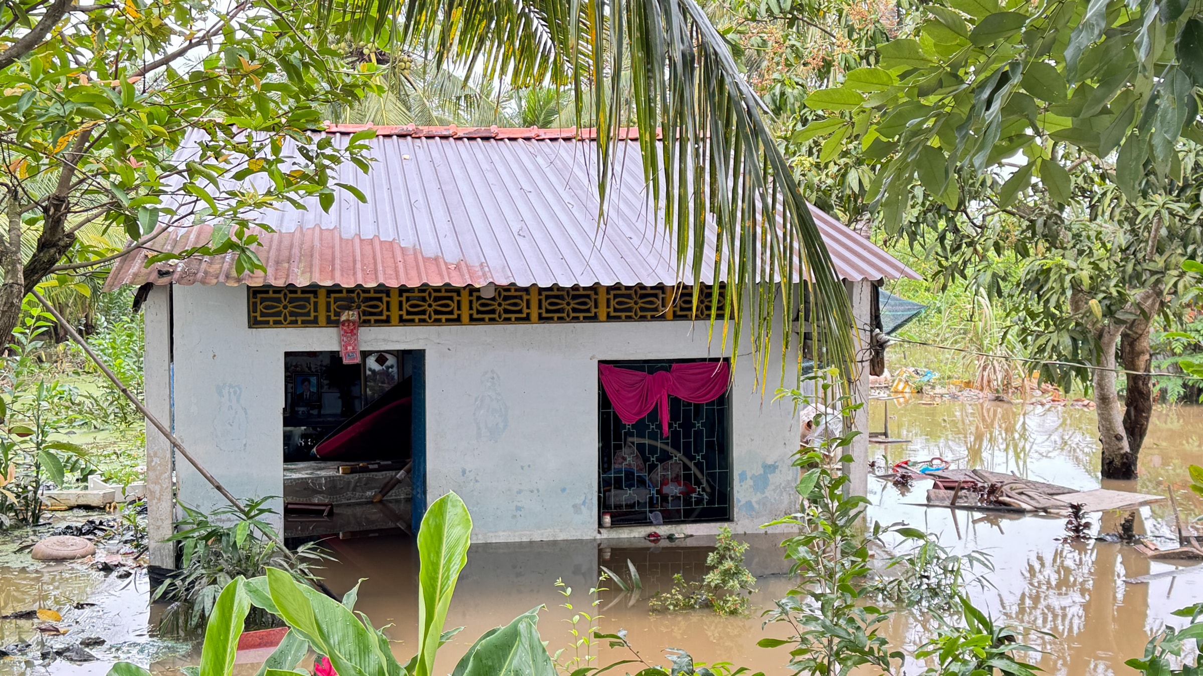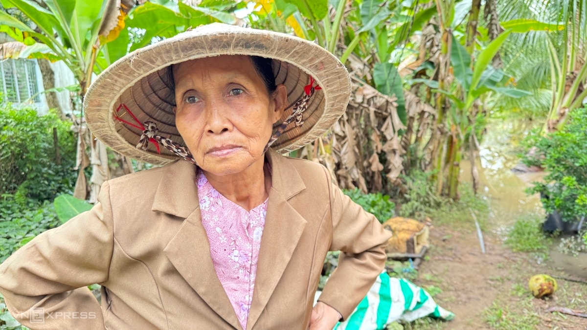 "Gia đình có hơn 4.000 m2 đất, trồng gần 150 cây dừa và ao nuôi cá các loại. Nhà ngập tới bụng, lượng phân bón dự trữ trị giá khoảng hai triệu đồng bị hư hỏng hết. Ao cá sắp kêu bán thì đi hết", bà Gặp nói và mong chính quyền hỗ trợ gia cố đê để người dân yên tâm sống và làm ăn.