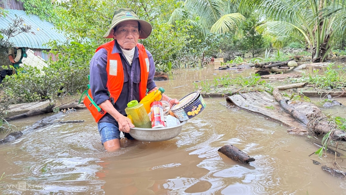 Ông Trần Văn Bảy (73 tuổi) thu gom các nhu yếu phẩm, vật dụng còn dùng được trong căn nhà bị ngập lên bờ đê để tạm.