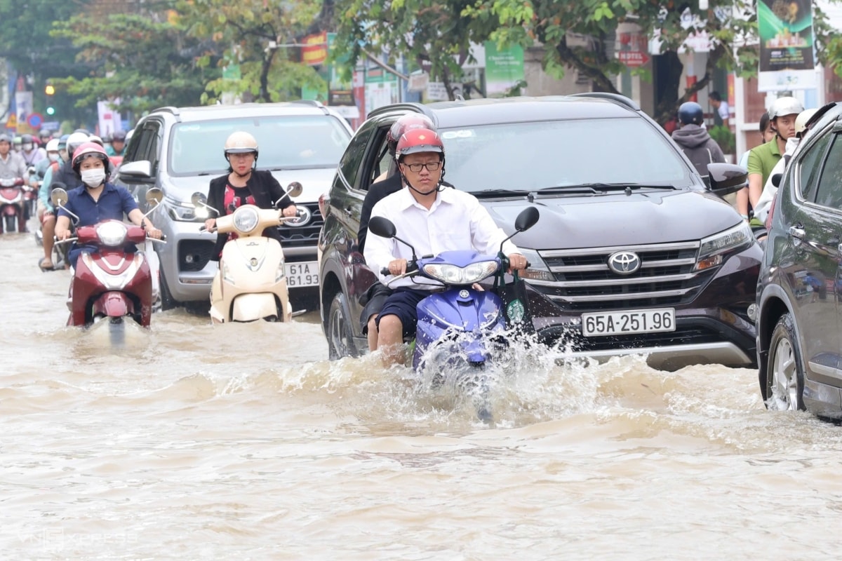 Đường Cách Mạng Tháng Tám, một trong nhiều tuyến đường ở trung tâm TP Cần Thơ, bị ngập 0,3-0,5 m sáng nay, gây ảnh hưởng tới đi lại của người dân.