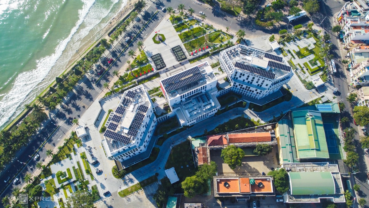 Tòa nhà nằm góc xéo với đường Trần Phú, hướng ra biển về phía Đông Nam - nơi có cột mốc chủ quyền ở đặc khu Trường Sa thể hiện khát khao "làm chủ đại dương, làm giàu từ biển đảo quê hương".