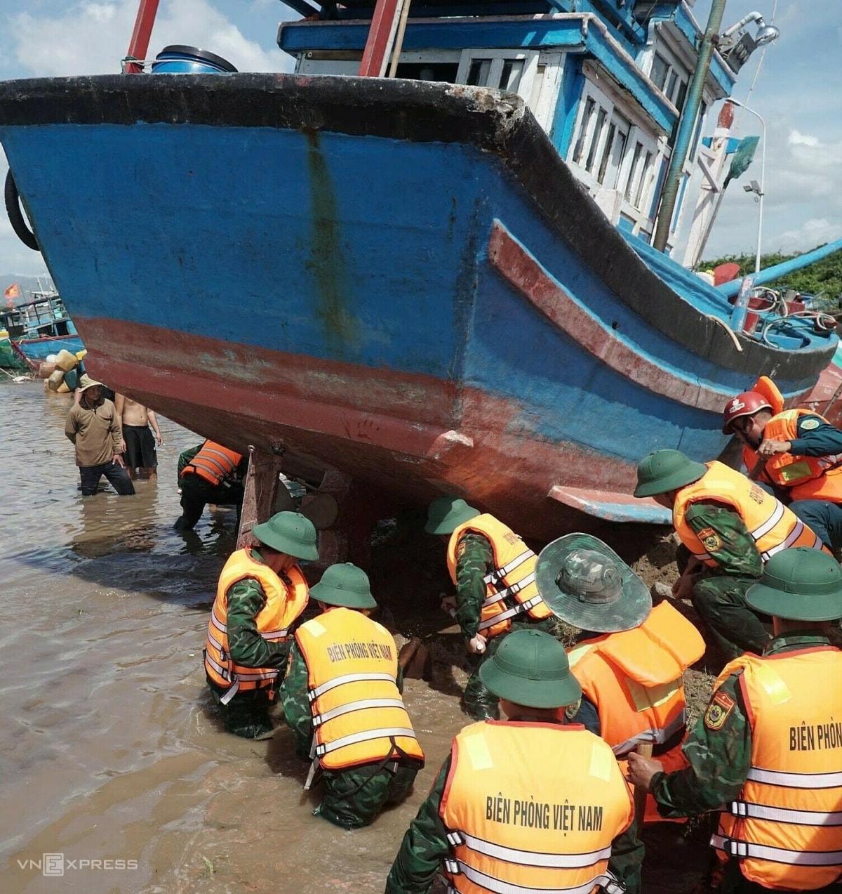 Hàng chục chiến sĩ biên phòng tỉnh Lâm Đồng tham gia trục vớt, sửa chữa các tàu cá hư hỏng. Trước đó, lực lượng này đã di dời nhiều người cũng như tài sản đến nơi an toàn.