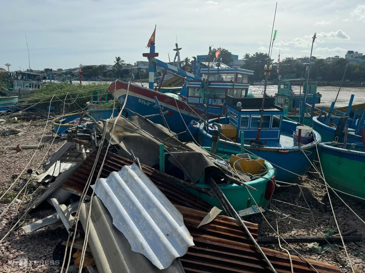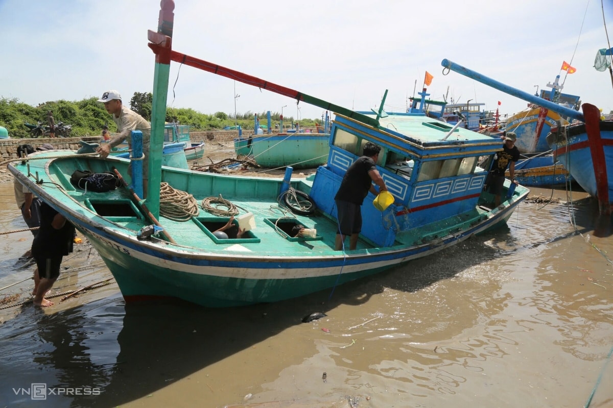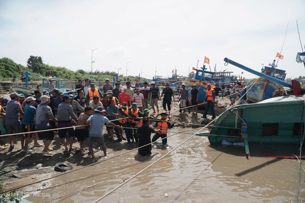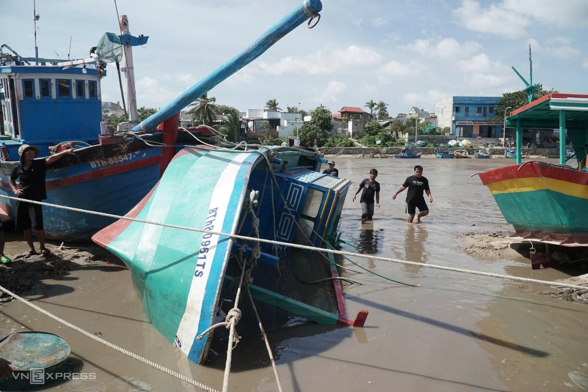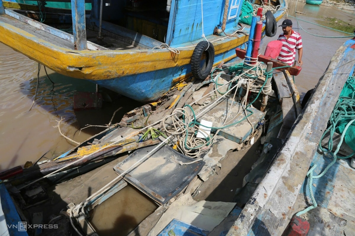Một tàu cá bị đánh chìm lật nghiêng mắc cạn ở lòng sông. Chủ nhân và nhiều người làm thuê đang tìm cách lật lại tàu để sửa chữa. "Tôi mới đi đánh bắt về, mặc dù neo đậu buộc chặt rồi nhưng dòng nước về mạnh quá, không kịp trở tay", anh Chín, 56 tuổi nói.