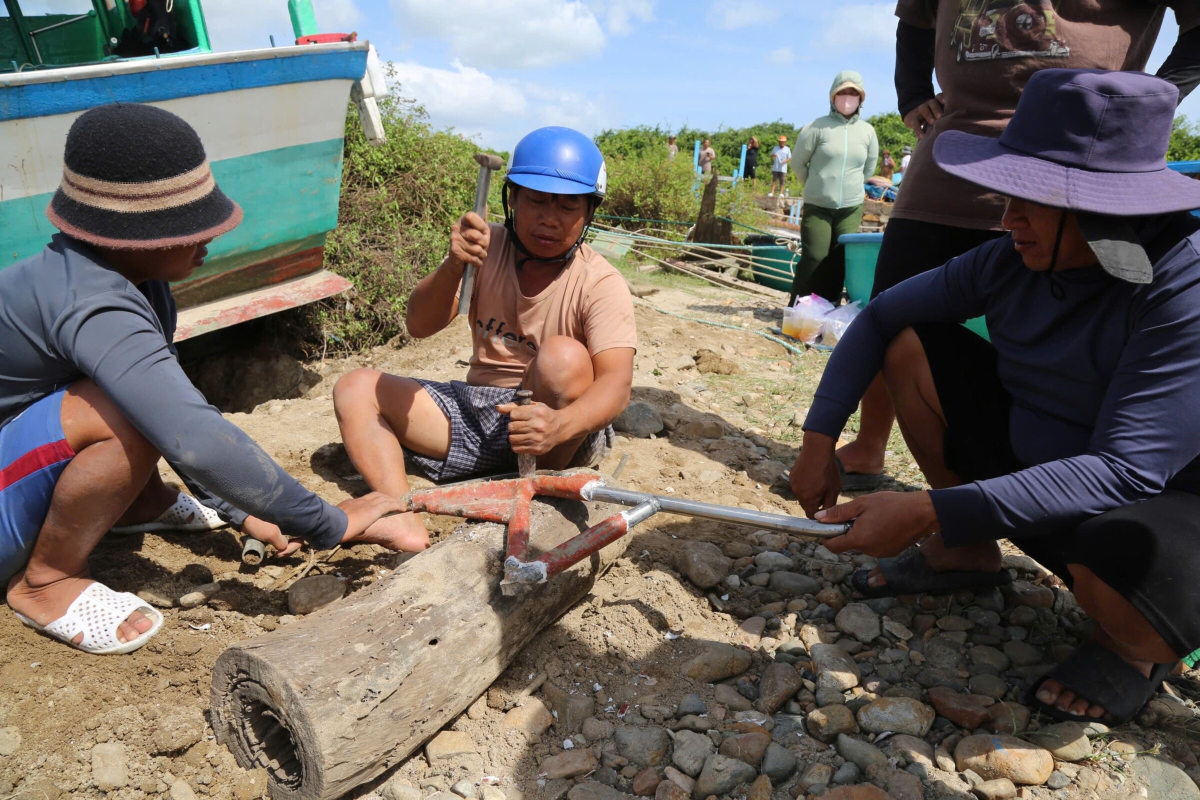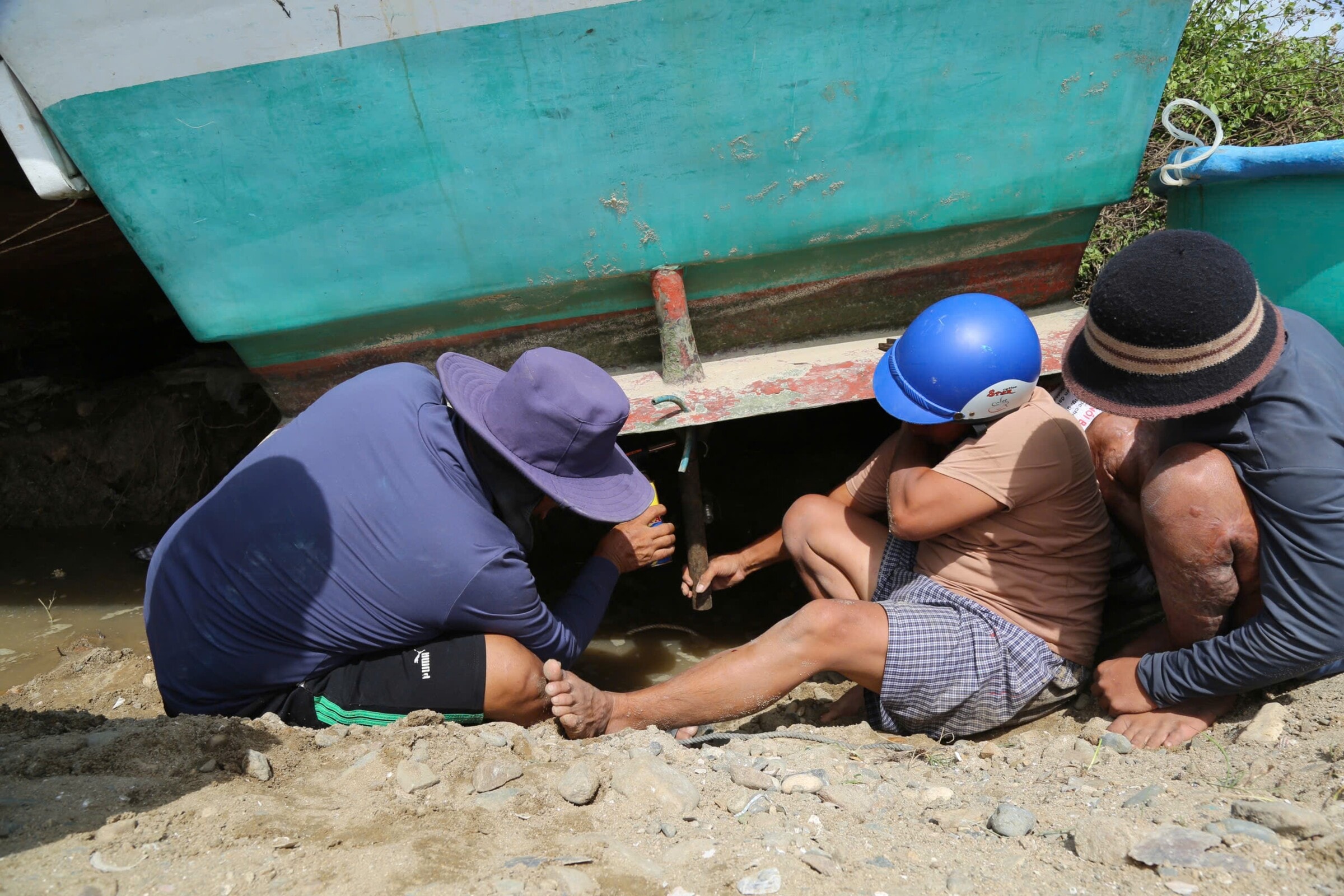 Ngư dân cùng dọn dẹp, sửa chữa tàu cá bị va đập hư hỏng trên sông Phước Thể.