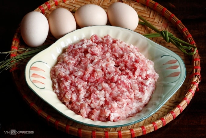 Chuẩn bị các nguyên liệu khác: Thịt nạc vai mềm băm nhỏ giúp món trứng chiên cốm thêm vị ngon ngọt tự nhiên. Hành lá rửa sạch, cắt nhỏ. Các gia vị nêm nếm quen thuộc gồm mắm, muối, hạt tiêu và chút mì chính (tuỳ chọn).